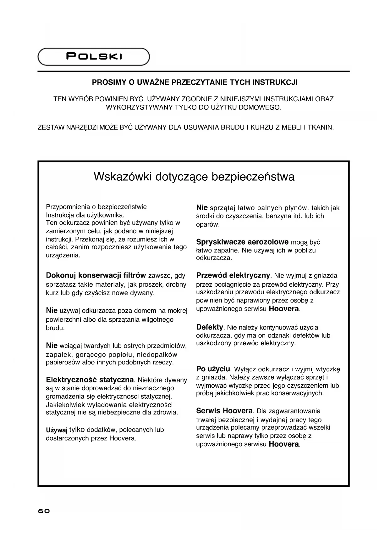 Przypomnienia o bezpieczeństwie Instrukcja dla użytkownika. Ten odkurzacz powinien być używany tylko w zamierzonym celu, jak podano w niniejszej instrukcji. Przekonaj się, że rozumiesz ich w całości, zanim rozpoczniesz użytkowanie tego urządzenia. Dokonuj konserwacji filtrów zawsze, gdy sprzątasz takie materiały, jak proszek, drobny kurz lub gdy czyścisz nowe dywany. Nie używaj odkurzacza poza domem na mokrej powierzchni albo dla sprzątania wilgotnego brudu. Nie wciągaj twardych lub ostrych przedmiotów, zapałek, gorącego popiołu, niedopałków papierosów albo innych podobnych rzeczy. Elektryczność statyczna. Niektóre dywany są w stanie doprowadzać do nieznacznego gromadzenia się elektryczności statycznej. Jakiekolwiek wyładowania elektryczności statycznej nie są niebezpieczne dla zdrowia. Używaj tylko dodatków, polecanych lub dostarczonych przez Hoovera. Nie sprzątaj łatwo palnych płynów, takich jak środki do czyszczenia, benzyna itd. lub ich oparów. Spryskiwacze aerozolowe mogą być łatwo zapalne. Nie używaj ich w pobliżu odkurzacza. Przewód elektryczny. Nie wyjmuj z gniazda przez pociągnięcie za przewód elektryczny. Przy uszkodzeniu przewodu elektrycznego odkurzacz powinien być naprawiony przez osobę z upoważnionego serwisu Hoovera. Defekty. Nie należy kontynuować użycia odkurzacza, gdy ma on odznaki defektów lub uszkodzony przewód elektryczny. Po użyciu. Wyłącz odkurzacz i wyjmij wtyczkę z gniazda. Należy zawsze wyłączać sprzęt i wyjmować wtyczkę przed jego czyszczeniem lub próbą jakichkolwiek prac konserwacyjnych. Serwis Hoovera. Dla zagwarantowania trwałej bezpiecznej i wydajnej pracy tego urządzenia polecamy przeprowadzać wszelki serwis lub naprawy tylko przez osobę z upoważnionego serwisu Hoovera. PROSIMY O UWAŻNE PRZECZYTANIE TYCH INSTRUKCJI TEN WYRÓB POWINIEN BYĆ UŻYWANY ZGODNIE Z NINIEJSZYMI INSTRUKCJAMI ORAZ WYKORZYSTYWANY TYLKO DO UŻYTKU DOMOWEGO. ZESTAW NARZĘDZI MOŻE BYĆ UŻYWANY DLA USUWANIA BRUDU I KURZU Z MEBLI I TKANIN. Wskazówki dotyczące bezpieczeństwa61 Wymagania elektryczne TO URZĄDZENIE POSIADA PODWÓJNĄ IZOLACJĘ I NIE MUSI BYĆ UZIEMIANE. UWAGA: PRZEWODY W KABLU ELEKTRYCZNYM MAJĄ KOLORY ZGODNIE Z NASTĘPUJĄCYM KODEM:
