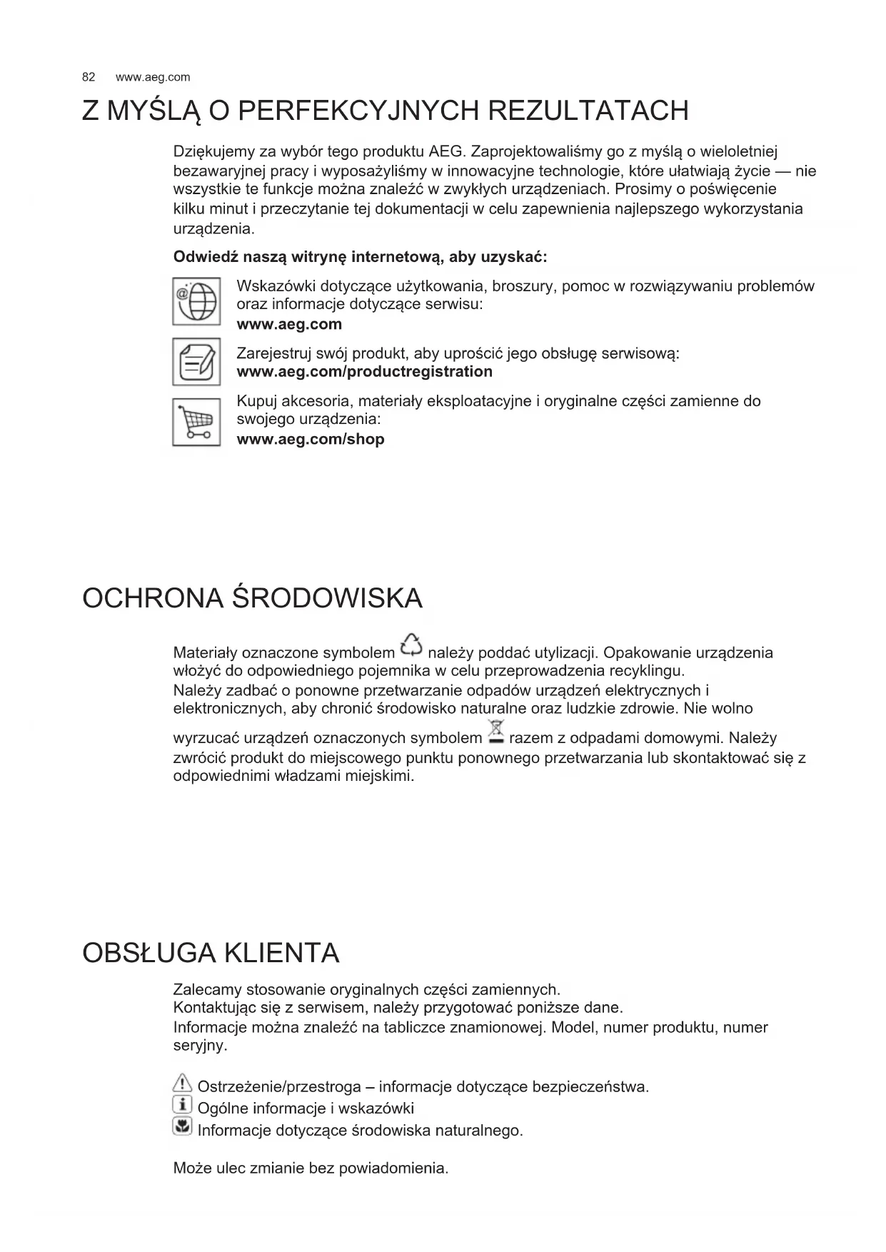 Dziękujemy za wybór tego produktu AEG. Zaprojektowaliśmy go z myślą o wieloletniej bezawaryjnej pracy i wyposażyliśmy w innowacyjne technologie, które ułatwiają życie — nie wszystkie te funkcje można znaleźć w zwykłych urządzeniach. Prosimy o poświęcenie kilku minut i przeczytanie tej dokumentacji w celu zapewnienia najlepszego wykorzystania urządzenia. Odwiedź naszą witrynę internetową, aby uzyskać: Wskazówki dotyczące użytkowania, broszury, pomoc w rozwiązywaniu problemów oraz informacje dotyczące serwisu: www.aeg.com Zarejestruj swój produkt, aby uprościć jego obsługę serwisową: www.aeg.com/productregistration Kupuj akcesoria, materiały eksploatacyjne i oryginalne części zamienne do swojego urządzenia: www.aeg.com/shop OCHRONA ŚRODOWISKA Materiały oznaczone symbolem należy poddać utylizacji. Opakowanie urządzenia włożyć do odpowiedniego pojemnika w celu przeprowadzenia recyklingu. Należy zadbać o ponowne przetwarzanie odpadów urządzeń elektrycznych i elektronicznych, aby chronić środowisko naturalne oraz ludzkie zdrowie. Nie wolno wyrzucać urządzeń oznaczonych symbolem razem z odpadami domowymi. Należy zwrócić produkt do miejscowego punktu ponownego przetwarzania lub skontaktować się z odpowiednimi władzami miejskimi.