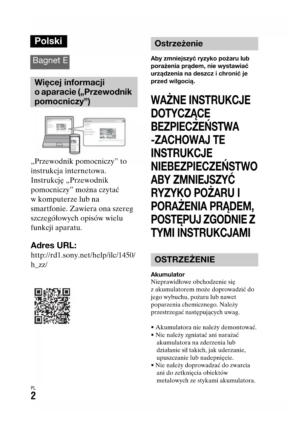 „Przewodnik pomocniczy” to instrukcja internetowa. Instrukcję „Przewodnik pomocniczy” można czytać w komputerze lub na smartfonie. Zawiera ona szereg szczegółowych opisów wielu funkcji aparatu. Adres URL: http://rd1.sony.net/help/ilc/1450/ h_zz/ Aby zmniejszyć ryzyko pożaru lub porażenia prądem, nie wystawiać urządzenia na deszcz i chronić je przed wilgocią.