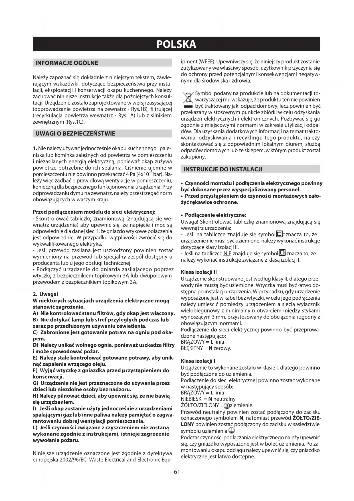 Wniektórychsytuacjachurządzeniaelektrycznemogą stanowićzagrożenie. A)Niekontrolowaćstanufiltrów,gdyokapjestwłączony. B)Niedotykaćlamplubstrefprzyległychpodczaslub zarazpoprzedłużonymużywaniuoświetlenia. C) Zabronione jest gotowanie potraw na ogniu pod oka- pem. D)Należyunikaćwolnegoognia,ponieważuszkadzafiltry imożespowodowaćpożar. E)Należystalekontrolowaćgotowanepotrawy,abyunik- nąćzapaleniawrzącegooleju. F)Wyjąćwtyczkęzgniazdkaprzedprzystąpieniemdo konserwacji. G)Urządzenieniejestprzeznaczonedoużywaniaprzez dzieci lub niezdolne osoby bez nadzoru. H)Należypilnowaćdzieci,abyupewnićsię,żeniebawią sięurządzeniem. I)Jeśliokapzostanieużytyjednocześniezurządzeniami spalającymigazlubinnepaliwanależypamiętaćozagwa- rantowaniu dobrej wentylacji pomieszczenia. L)Jeśliczynnościzwiązanezczyszczeniemniezostaną wykonanezgodniezinstrukcjami,istniejezagrożenie wywołaniapożaru. Niniejsze urządzenie oznaczone jest zgodnie z dyrektywa europejska 2002/96/EC, Waste Electrical and Electronic Equ- ipment (WEEE). Upewniwszy się, że niniejszy produkt zostanie zutylizowany we właściwy sposób, użytkownik przyczynia się do ochrony przed potencjalnymi konsekwencjami negatyw- nymi dla środowiska i zdrowia. Symbol podany na produkcie lub na dokumentacji to- warzyszącej mu wskazuje, że produktu ten nie powinien być traktowany jaki odpad domowy, lecz powinien być przekazany w stosownym punkcie zbiórki w celu odzyskania urządzeń elektrycznych i elektronicznych. Pozbywać się go zgodnie z miejscowymi normami w zakresie utylizacji odpa- dów. Dla uzyskania dodatkowych informacji na temat trakto- wania, odzyskiwania i recyklingu tego produktu, należy skontaktować się z odpowiednim lokalnym biurem, służbą odpadów domowych lub ze sklepem, w którym produkt został zakupiony.