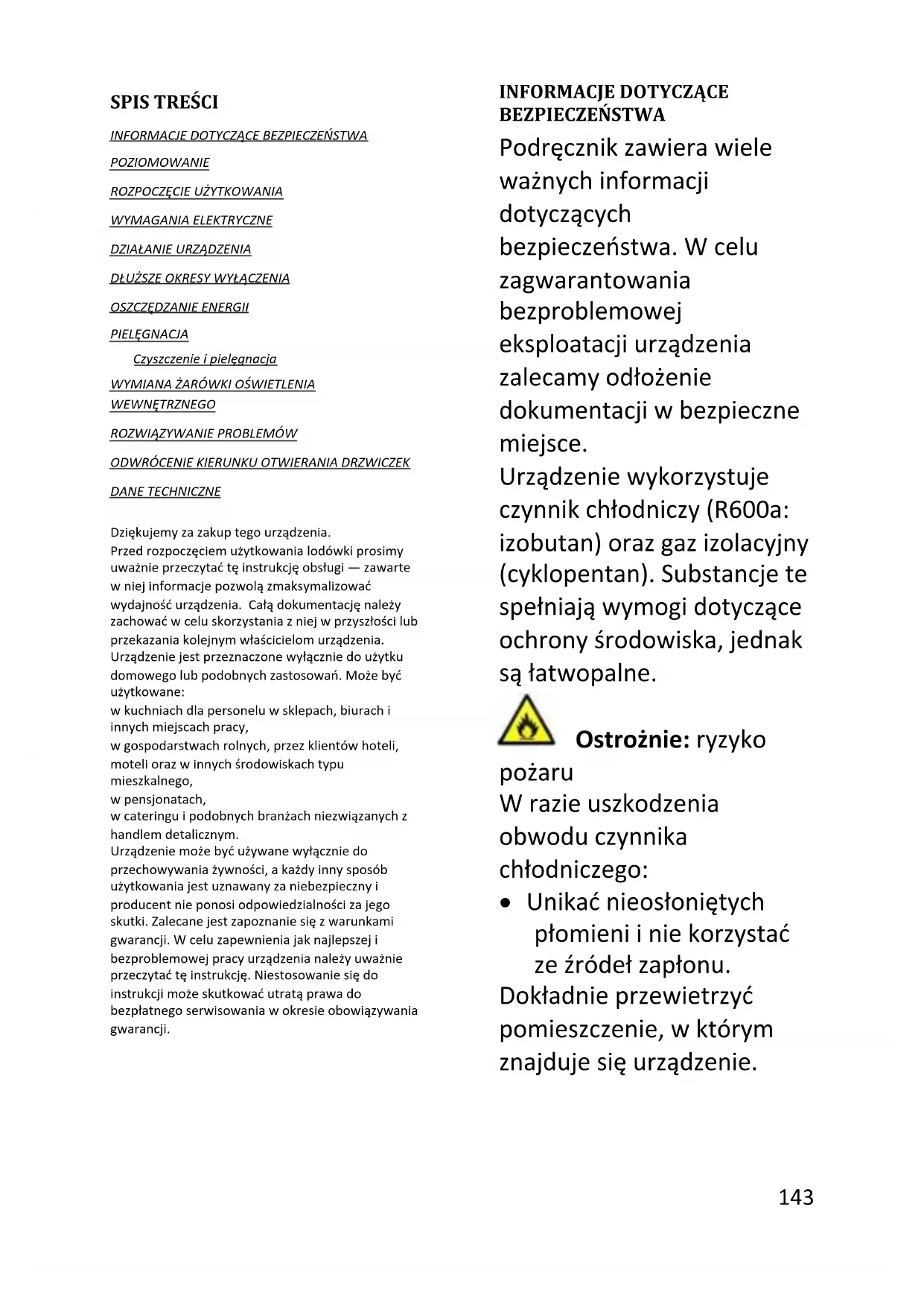 BEZPIECZEŃSTWA Podręcznik zawiera wiele ważnych informacji dotyczących bezpieczeństwa. W celu zagwarantowania bezproblemowej eksploatacji urządzenia zalecamy odłożenie dokumentacji w bezpieczne miejsce. Urządzenie wykorzystuje czynnik chłodniczy (R600a: izobutan) oraz gaz izolacyjny (cyklopentan). Substancje te spełniają wymogi dotyczące ochrony środowiska, jednak są łatwopalne. Ostrożnie: ryzyko pożaru W razie uszkodzenia obwodu czynnika chłodniczego: