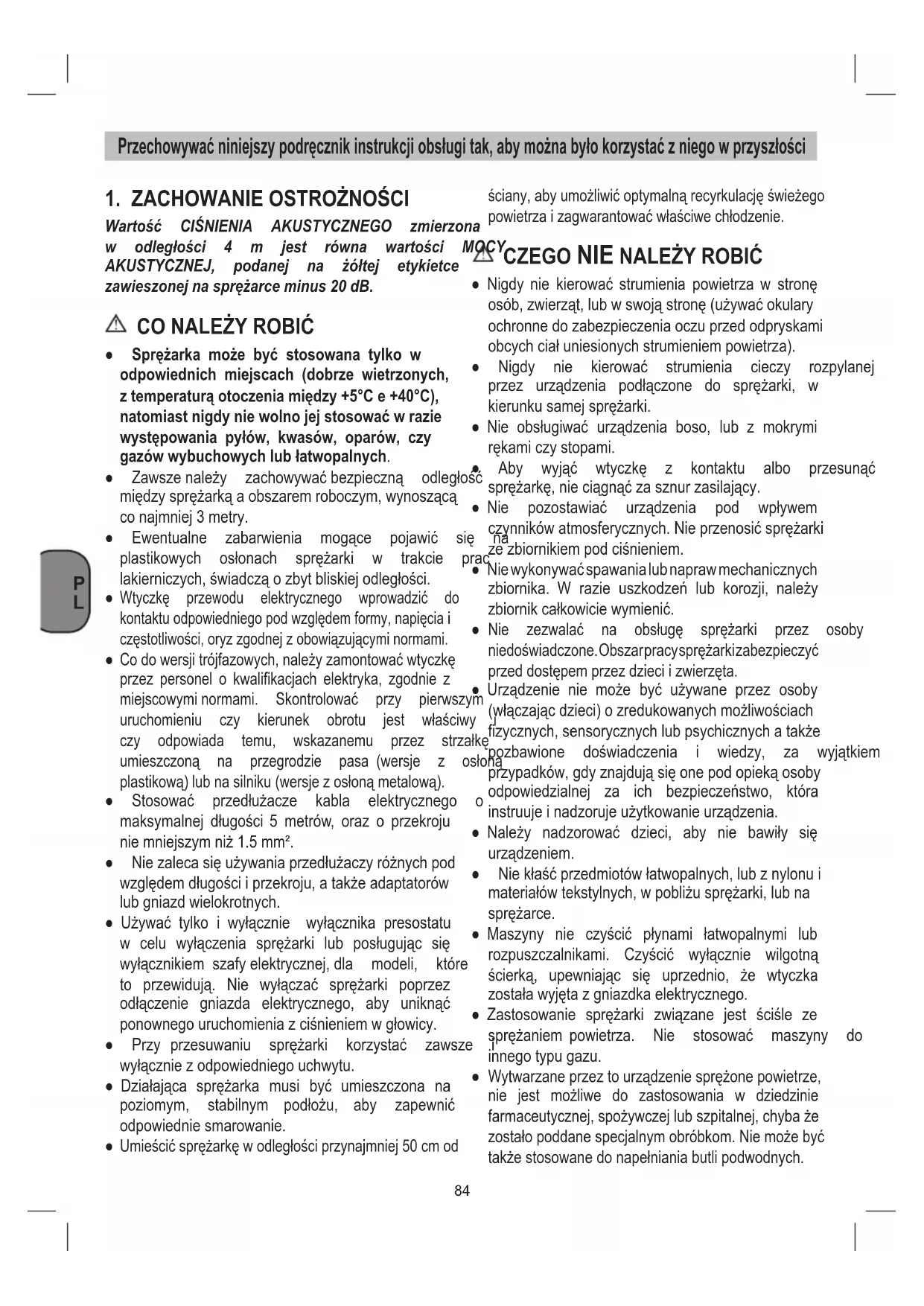 Nie zezwalać na obsługę sprężarki przez osoby niedoświadczone.Obszarpracysprężarkizabezpieczyć przeddostępemprzezdzieciizwierzęta. ● Urządzenie nie może być używane przez osoby (włączającdzieci)ozredukowanychmożliwościach fizycznych,sensorycznychlubpsychicznychatakże pozbawione doświadczenia i wiedzy, za wyjątkiem przypadków,gdyznajdująsięonepodopiekąosoby odpowiedzialnej za ich bezpieczeństwo, która instruujeinadzorujeużytkowanieurządzenia. ● Należy nadzorować dzieci, aby nie bawiły się urządzeniem. ● Niekłaśćprzedmiotówłatwopalnych,lubznylonui materiałówtekstylnych,wpobliżusprężarki,lubna sprężarce. ● Maszyny nie czyścić płynami łatwopalnymi lub rozpuszczalnikami. Czyścić wyłącznie wilgotną ścierką, upewniając się uprzednio, że wtyczka zostaławyjętazgniazdkaelektrycznego. ● Zastosowanie sprężarki związane jest ściśle ze sprężaniem powietrza. Nie stosować maszyny do innegotypugazu.