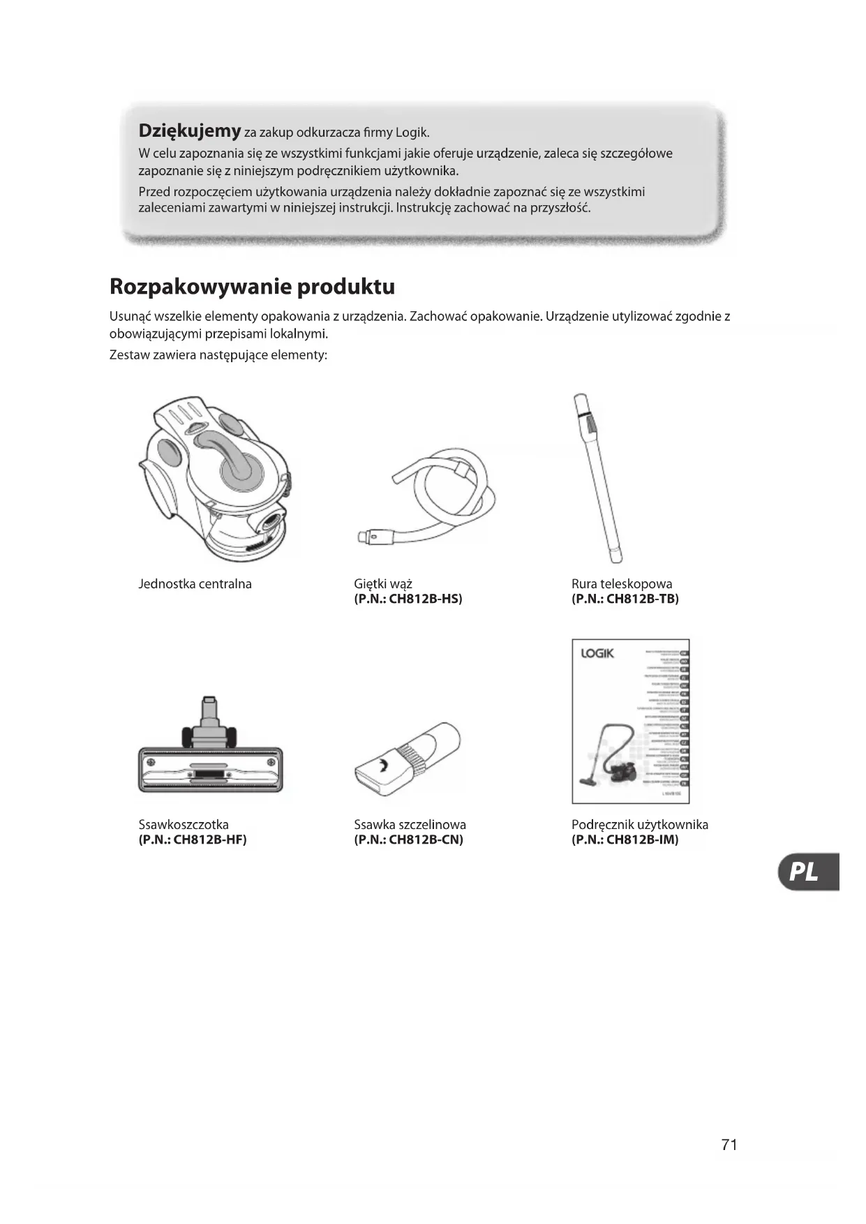 Rozpakowywanie produktu Usunąć wszelkie elementy opakowania z urządzenia. Zachować opakowanie. Urządzenie utylizować zgodnie z obowiązującymi przepisami lokalnymi. Zestaw zawiera następujące elementy: Dziękujemy za zakup odkurzacza rmy Logik. W celu zapoznania się ze wszystkimi funkcjami jakie oferuje urządzenie, zaleca się szczegółowe zapoznanie się z niniejszym podręcznikiem użytkownika. Przed rozpoczęciem użytkowania urządzenia należy dokładnie zapoznać się ze wszystkimi zaleceniami zawartymi w niniejszej instrukcji. Instrukcję zachować na przyszłość. Jednostka centralna Ssawkoszczotka (P.N.: CH812B-HF) Giętki wąż (P.N.: CH812B-HS) Ssawka szczelinowa (P.N.: CH812B-CN) Rura teleskopowa (P.N.: CH812B-TB) Podręcznik użytkownika (P.N.: CH812B-IM)72