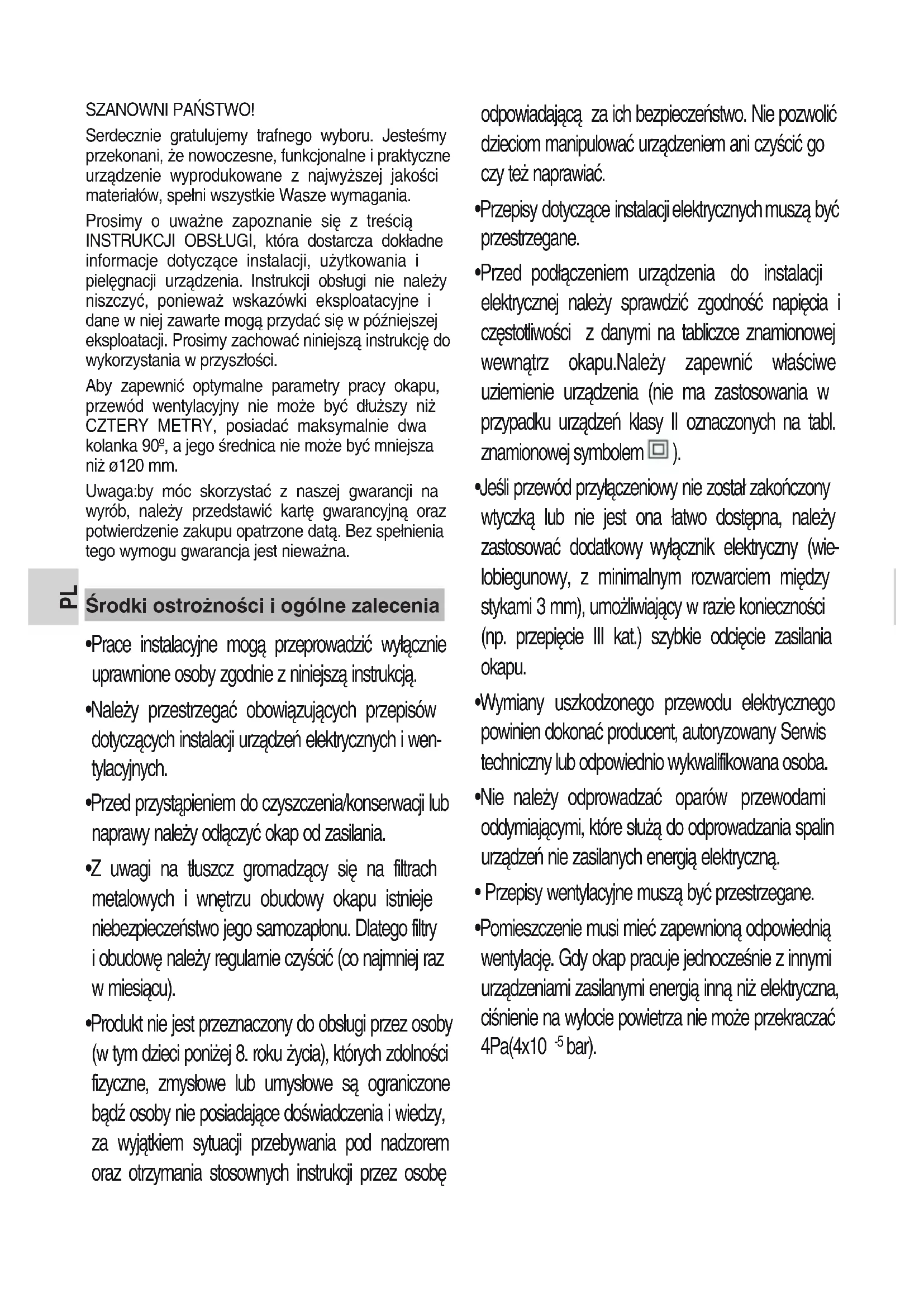 - Pomieszczenie musi mieć zapewnioną odpowiednią wentylację. Gdy okap pracuje jednocześnie z innymi urządzeniami zasilanymi energią inną niż elektryczna, ciśnienie na wylocie powietrza nie może przekraczać 4 Pa (4x10