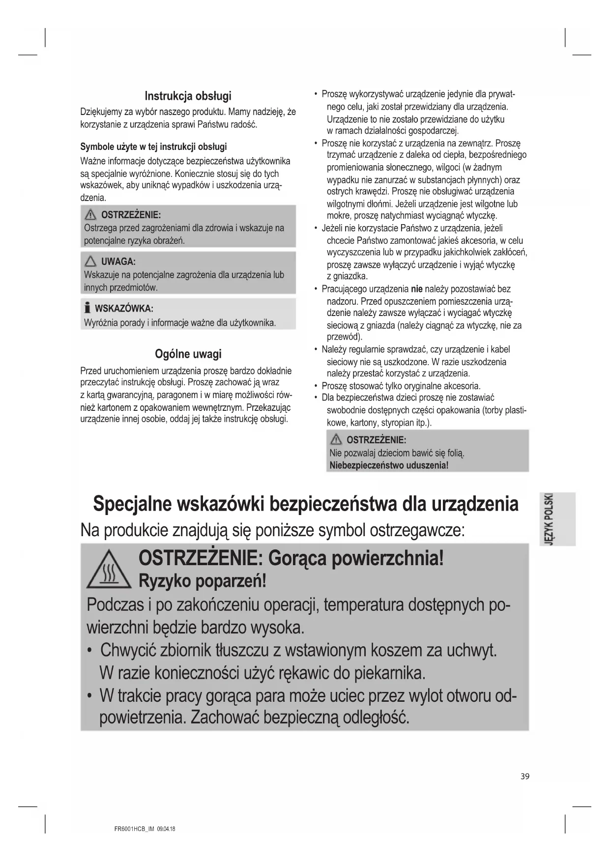 - Urządzenia nie należy zanurzać w wodzie podczas czyszczenia. Przestrzegać instrukcji załączonej w rozdziale „Czyszczenie”.FR6001HCB_IM 09.04.18