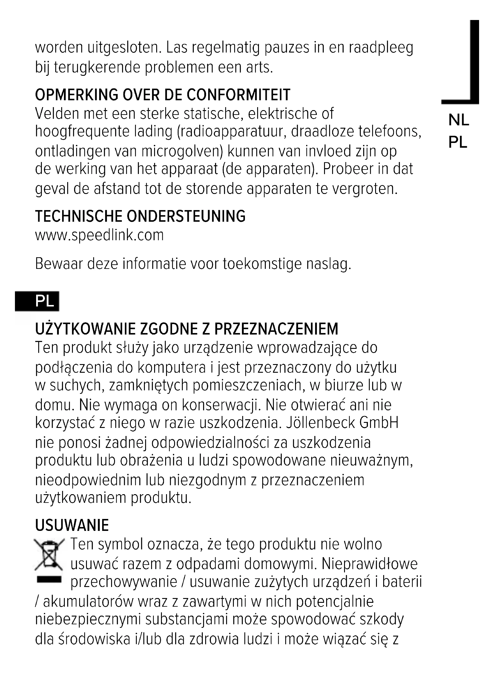 Silne pola elektrostatyczne, elektryczne lub elektromagnetyczne o wysokiej częstotliwości (urządzenia radiowe, telefony przenośne, telefony komórkowe, mikrofalówki, rozładowania elektryczne) mogą być przyczyną zakłóceń w działaniu urządzenia (urządzeń). W takim wypadku należy zachować większą odległość od źródeł zakłóceń. POMOC TECHNICZNA www.speedlink.com Prosimy zachować tę informację do późniejszego wykorzystania.