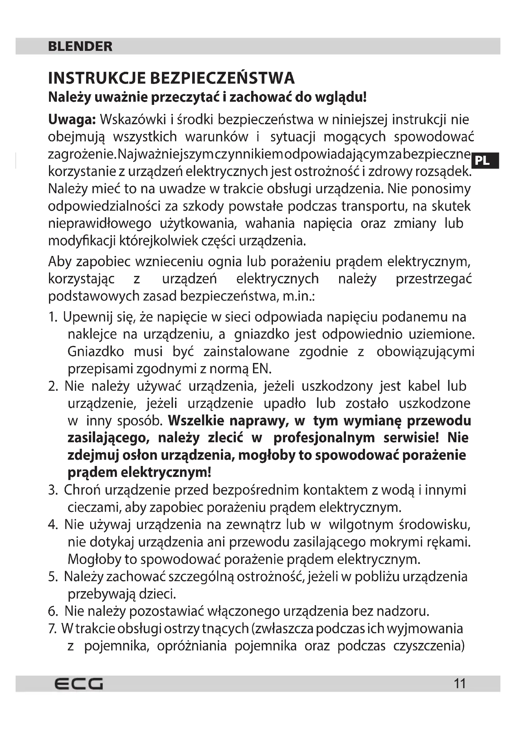 Papier służący do owinięcia i tektura falista – przekazać na wysypisko śmieci. Folia opakowaniowa, torby PE, elementy zplastiku – wrzucić do pojemników zplastikiem do recyklingu. USUWANIE PRODUKTÓW PO ZAKOŃCZENIU EKSPLOATACJI Usuwanie zużytego sprzętu elektrycznego i elektronicznego (dotyczy krajów członkowskich UE iinnych krajów europejskich zwprowadzonym systemem zbiórki odpadów)Przedstawiony symbol na produkcie lub opakowaniu oznacza, że produkt nie może być zaliczany do odpadów komunalnych. Należy go przekazać do odpowiedniego punktu zajmującego się recyklingiem sprzętu elektrycznego ielektronicznego. Prawidłowy recykling produktu zabiega negatywnym konsekwencjom dla zdrowia ludzkiego iśrodowiska naturalnego.Recykling przyczynia się do zachowania surowców naturalnych. W celu uzyskania dalszych informacji orecyklingu tego produktu należy się skontaktować zlokalnymi władzami, krajową organizacją zajmującą się przetwarzaniem odpadów lub sklepem, który sprzedał produkt. Produkt spełnia wymagania dyrektyw UE w zakresie kompatybilności elektromagnetycznej ibezpieczeństwa urządzeń elektrycznych. Instrukcja obsługi jest dostępna na stronie internetowej www.ecg-electro.eu. Zastrzegamy sobie prawo do zmiany tekstu i parametrów technicznych. 08/05BOTMIXER