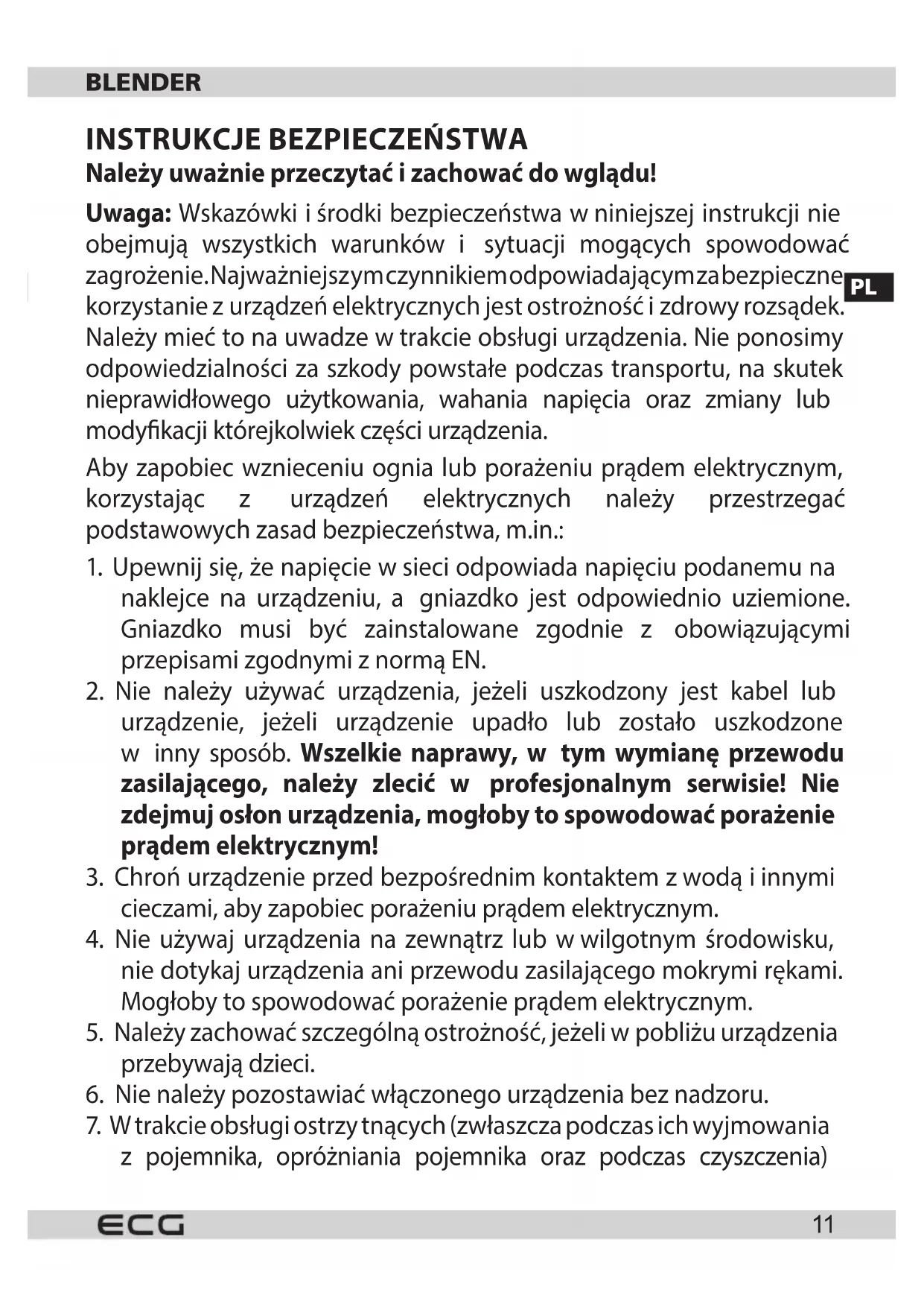 Należy uważnie przeczytać izachować do wglądu! Uwaga: Wskazówki iśrodki bezpieczeństwa wniniejszej instrukcji nie obejmują wszystkich warunków i sytuacji mogących spowodować zagrożenie. Najważniejsz ym czynnikiem odpowiadającym za bezpieczne korzystanie zurządzeń elektrycznych jest ostrożność izdrowy rozsądek. Należy mieć to na uwadze wtrakcie obsługi urządzenia. Nie ponosimy odpowiedzialności za szkody powstałe podczas transportu, na skutek nieprawidłowego użytkowania, wahania napięcia oraz zmiany lub modykacji którejkolwiek części urządzenia. Aby zapobiec wznieceniu ognia lub porażeniu prądem elektrycznym, korzystając z urządzeń elektrycznych należy przestrzegać podstawowych zasad bezpieczeństwa, m.in.: