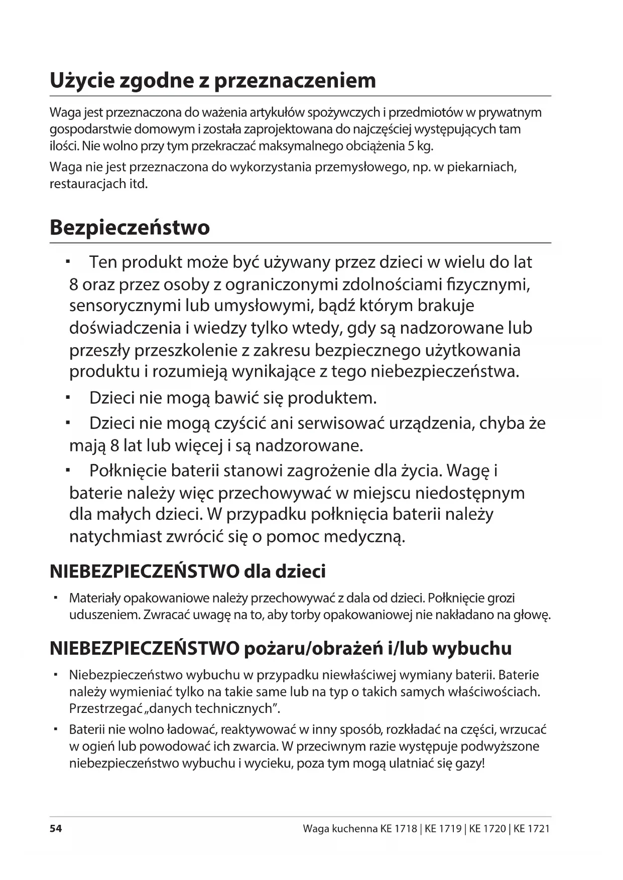 - Połknięcie baterii stanowi zagrożenie dla życia. Wagę i baterie należy więc przechowywać w miejscu niedostępnym dla małych dzieci. W przypadku połknięcia baterii należy natychmiast zwrócić się o pomoc medyczną.