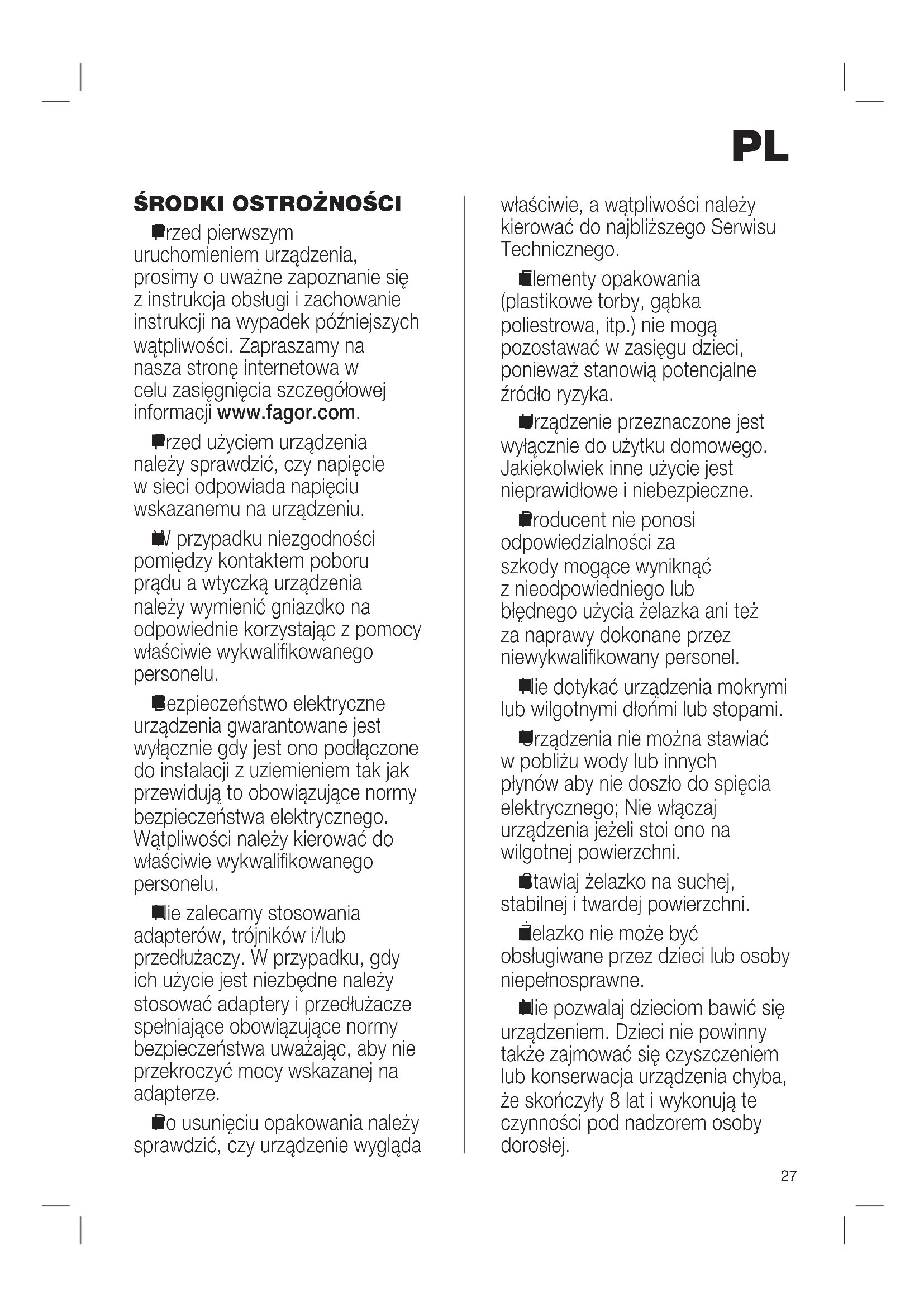 Przed pierwszym uruchomieniem urządzenia, prosimy o uważne zapoznanie się z instrukcja obsługi i zachowanie instrukcji na wypadek późniejszych wątpliwości. Zapraszamy na nasza stronę internetowa w celu zasięgnięcia szczegółowej informacji www.fagor.com.