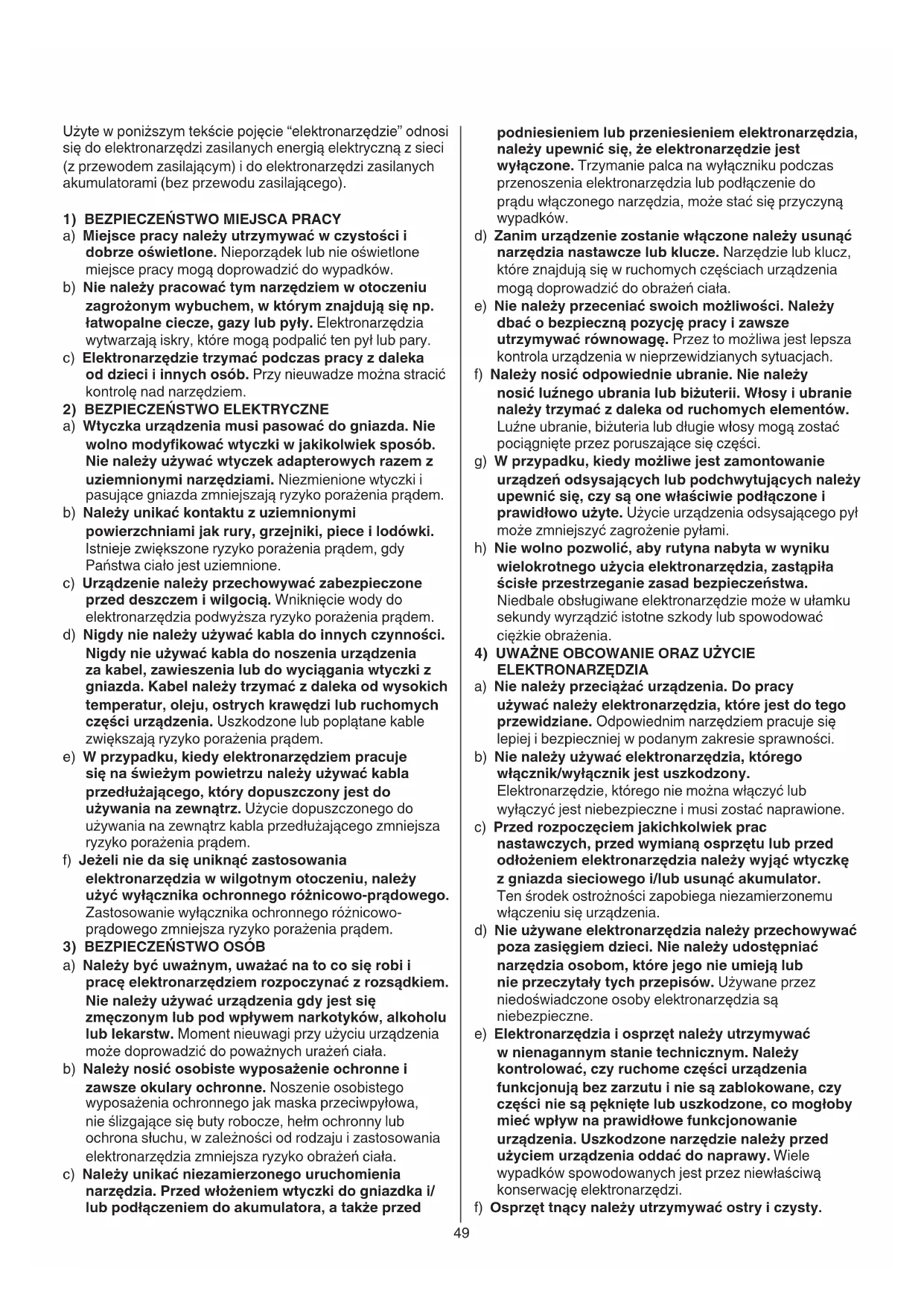 a) Należy być uważnym, uważać na to co się robi i pracę elektronarzędziem rozpoczynać z rozsądkiem. Nie należy używać urządzenia gdy jest się zmęczonym lub pod wpływem narkotyków, alkoholu lub lekarstw. Moment nieuwagi przy użyciu urządzenia może doprowadzić do poważnych urażeń ciała. b) Należy nosić osobiste wyposażenie ochronne i zawsze okulary ochronne. Noszenie osobistego wyposażenia ochronnego jak maska przeciwpyłowa, nie ślizgające się buty robocze, hełm ochronny lub ochrona słuchu, w zależności od rodzaju i zastosowania elektronarzędzia zmniejsza ryzyko obrażeń ciała. c) Należy unikać niezamierzonego uruchomienia narzędzia. Przed włożeniem wtyczki do gniazdka i/ lub podłączeniem do akumulatora, a także przed50