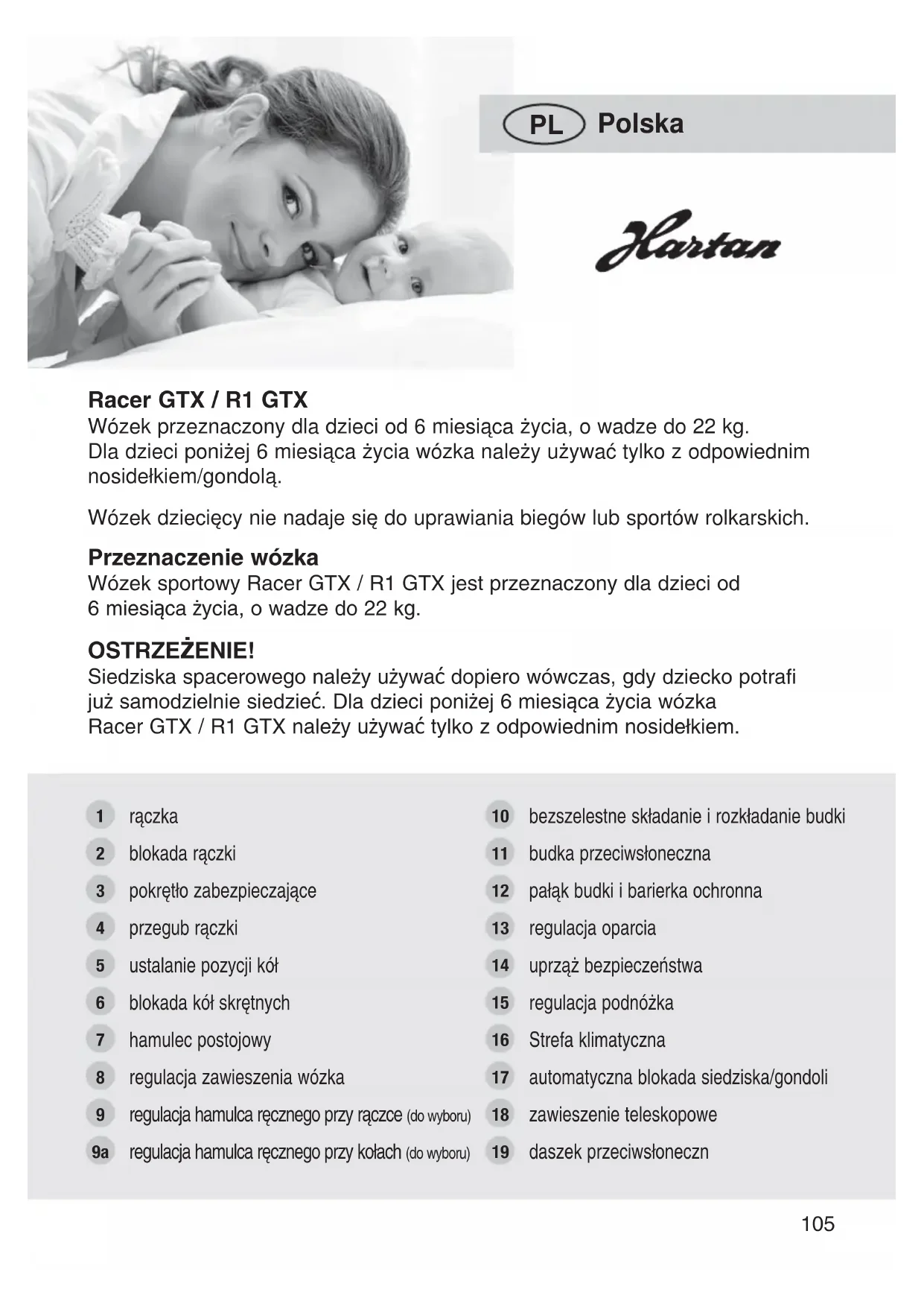 eÂÒÂÏÔÊËÏÝÇÐÃÁÉÂÔÇÍÞÓÔÄÂ104Przeznaczenie wózka Wózek sportowy Racer GTX / R1 GTX jest przeznaczony dla dzieci od 6 miesiąca Īycia, o wadze do 22 kg. OSTRZEĩENIE! Siedziska spacerowego naleĪy uĪywaü dopiero wówczas, gdy dziecko potrafi juĪ samodzielnie siedzieü. Dla dzieci poniĪej 6 miesiąca Īycia wózka Racer GTX / R1 GTX naleĪy uĪywaü tylko z odpowiednim nosidełkiem. Polska