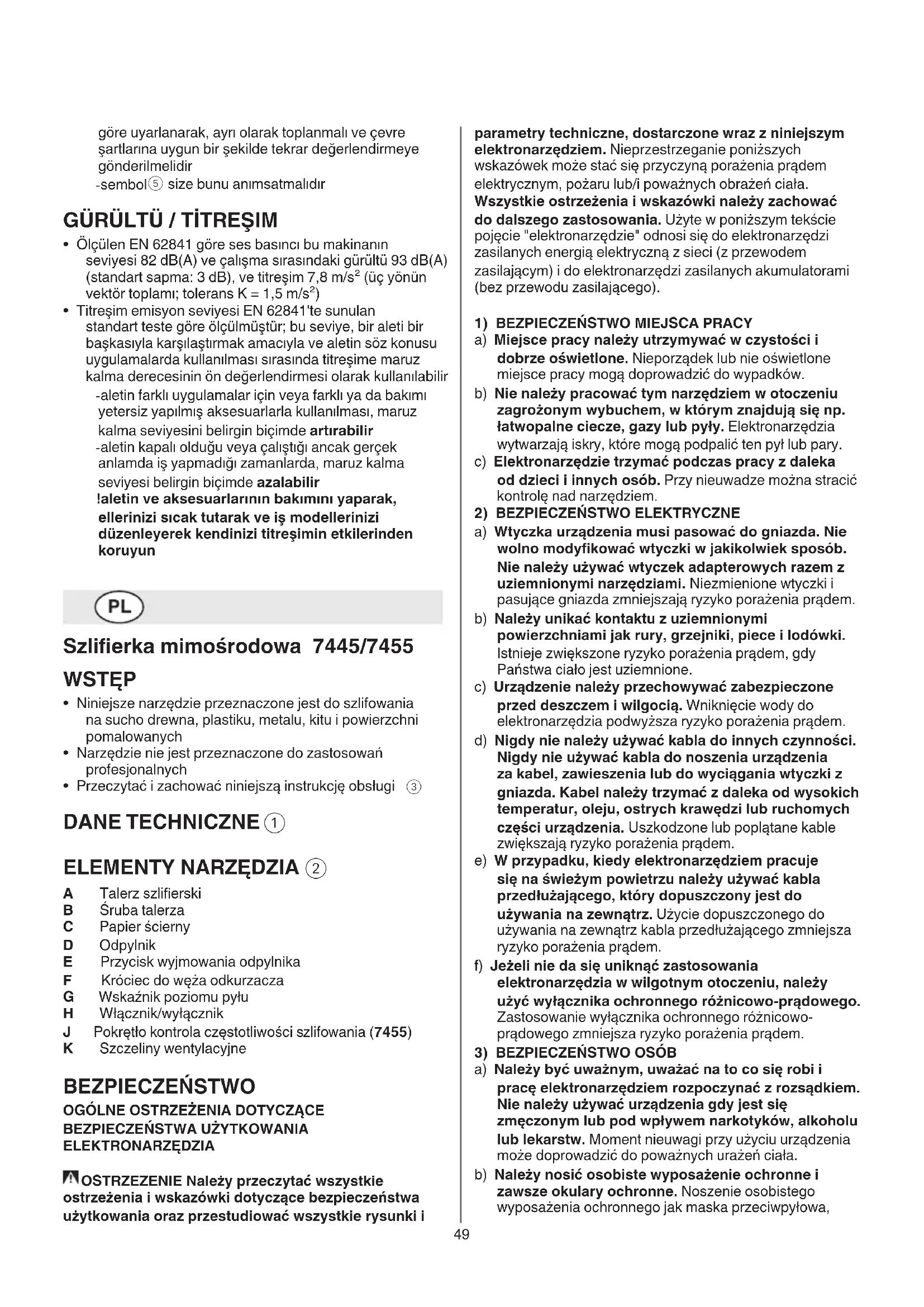 şalterini ileriye/geriye getirerek çalıştırabilirsiniz ! aletin zımparalama yüzeyi iş parçasına temas etmeden önce aletin çalıştırılması gerekir49 parametry techniczne, dostarczone wraz z niniejszym elektronarzędziem. Nieprzestrzeganie poniższych wskazówek może stać się przyczyną porażenia prądem elektrycznym, pożaru lub/i poważnych obrażeń ciała. Wszystkie ostrzeżenia i wskazówki należy zachować do dalszego zastosowania. Użyte w poniższym tekście pojęcie "elektronarzędzie" odnosi się do elektronarzędzi zasilanych energią elektryczną z sieci (z przewodem zasilającym) i do elektronarzędzi zasilanych akumulatorami (bez przewodu zasilającego).