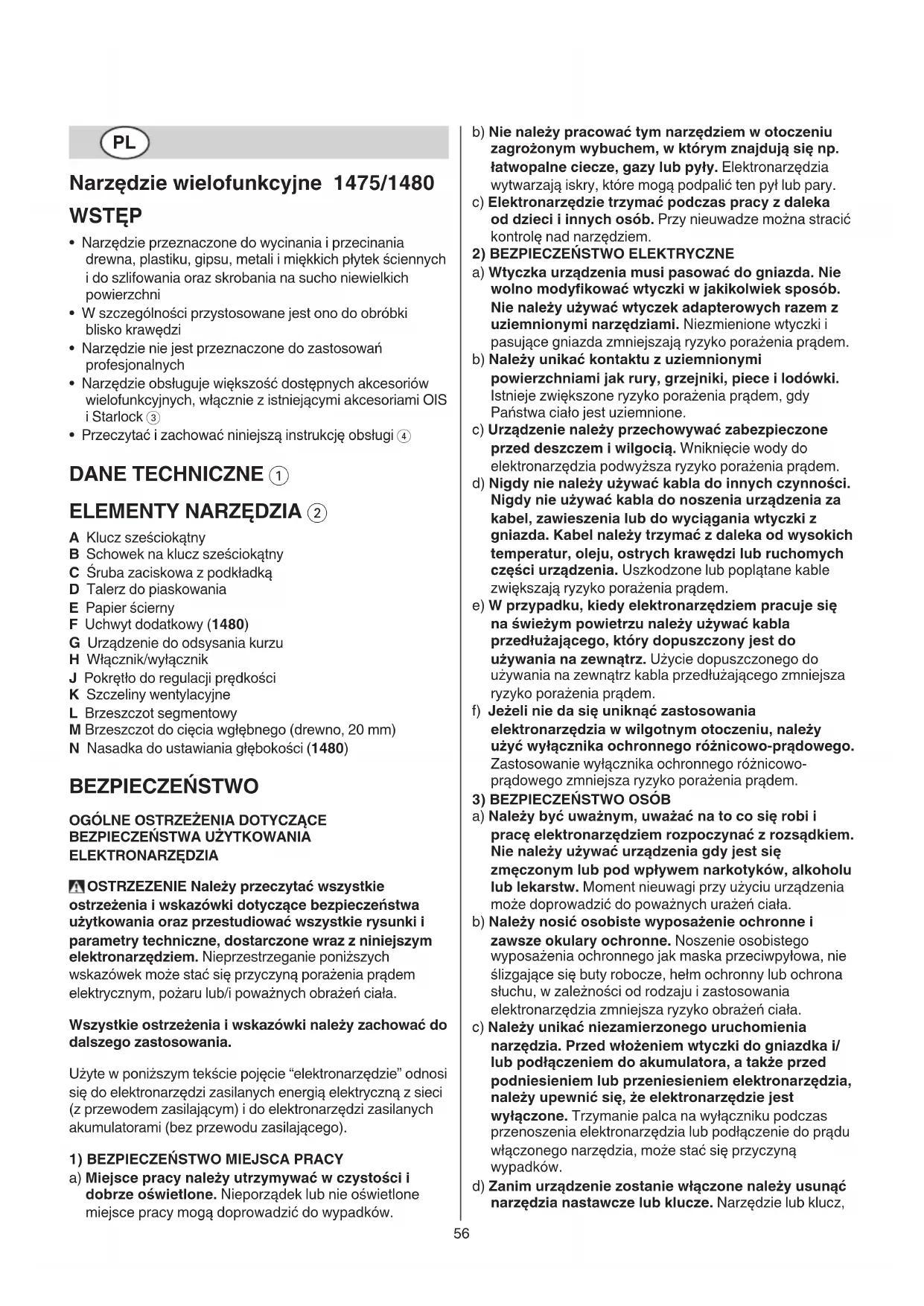A Klucz sześciokątny B Schowek na klucz sześciokątny C Śruba zaciskowa z podkładką D Talerz do piaskowania E Papier ścierny F Uchwyt dodatkowy (1480) G Urządzenie do odsysania kurzu H Włącznik/wyłącznik J Pokrętło do regulacji prędkości K Szczeliny wentylacyjne L Brzeszczot segmentowy M Brzeszczot do cięcia wgłębnego (drewno, 20 mm) N Nasadka do ustawiania głębokości (1480) BEZPIECZEŃSTWO