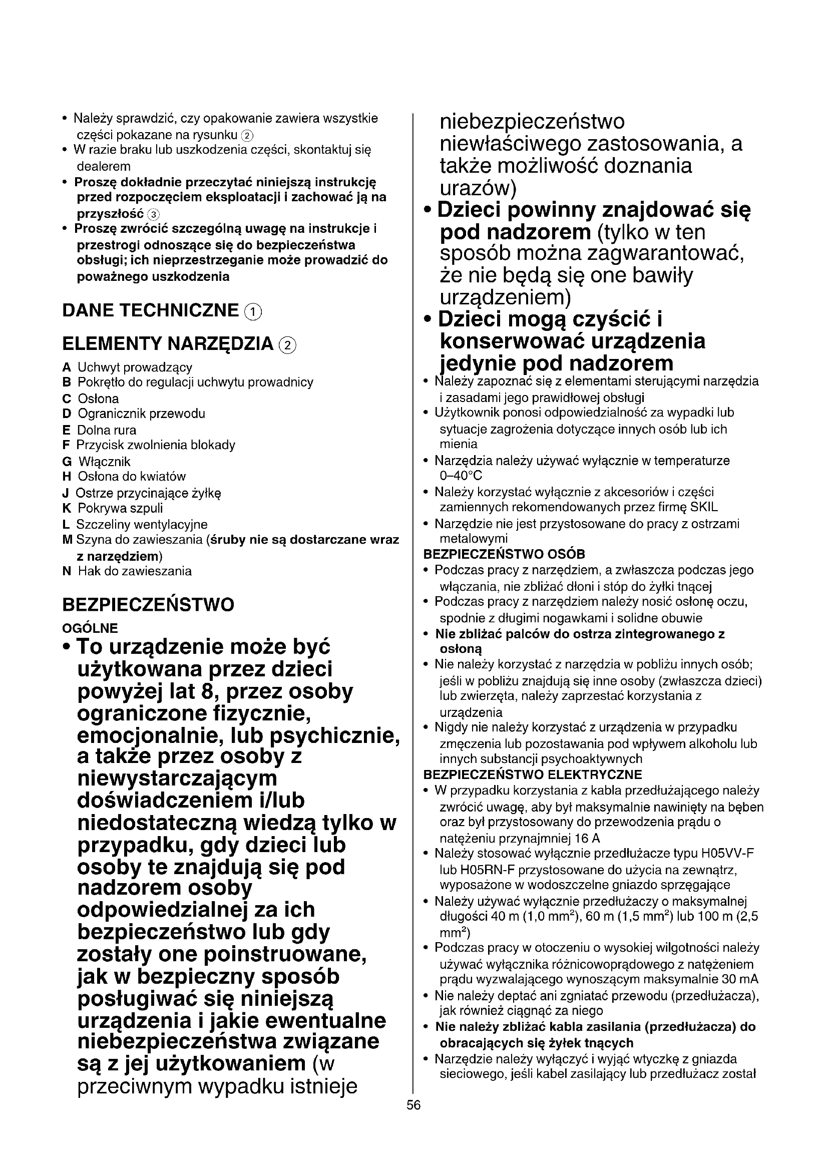 A Uchwyt prowadzący B Pokrętło do regulacji uchwytu prowadnicy C Osłona D Ogranicznik przewodu E Dolna rura F Przycisk zwolnienia blokady G Włącznik H Osłona do kwiatów J Ostrze przycinające żyłkę K Pokrywa szpuli L Szczeliny wentylacyjne M Szyna do zawieszania (śruby nie są dostarczane wraz z narzędziem) N Hak do zawieszania BEZPIECZEŃSTWO OGÓLNE