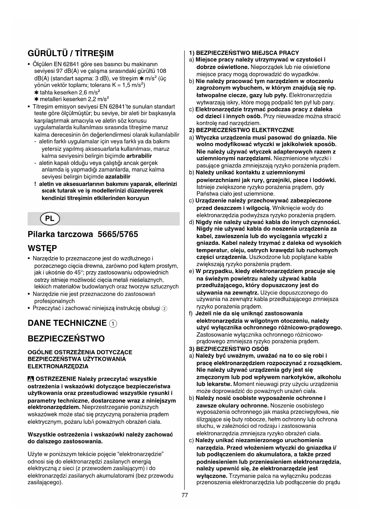NIEBEZPIECZEŃSTWO : Ręce należy trzymać z dala od obszaru pracy pilarki i zachować bezpieczną odległość od poruszającej się tarczy. Drugą ręką należy trzymać uchwyt dodatkowy lub obudowę silnika. Trzymając pilarkę oburącz można uniknąć skaleczenia rąk przez tarczę tnącą. b) Nie sięgaj ręką pod spód przecinanego materiału. Osłona nie chroni przed ostrzem poniżej przecinanej części. c) Dostosuj głębokość cięcia do grubości obrabianego materiału. Mniej niż pełna wysokość pojedyńczego zęba tarczy powinna być widoczna pod przecinanym materiałem. d) W żadnym wypadku nie wolno przytrzymywać przecinanego przedmiotu ręką, ani trzymać go na kolanach. Obrabiany przedmiot należy stabilnie umieścić na stałym podłożu. Właściwe zamocowanie obrabianego przedmiotu jest bardzo istotne, gdyż dzięki temu można zminimalizować niebezpieczeństwo, w przypadku kontaktu z ciałem użytkownika, zablokowania się brzeszczotu lub utraty kontroli nad sytuacją. e) Podczas prac, przy których elektronarzędzie mogłoby natrafić na ukryte przewody elektryczne lub na własny przewód, należy je trzymać tylko za izolowaną rękojeść. Pod wpływem kontaktu z przewodami będącymi pod napięciem, wszystkie części metalowe elektronarzędzia znajdą się również pod napięciem i mogą spowodować porażenie prądem osoby obsługującej. f) Przy cięciu wzdłużnym korzystaj ze specjalnej prowadnicy piły tarczowej lub z prostej prowadnicy do krawędzi. Poprawia to dokładność cięcia i redukuje możliwość zakleszczania się ostrza. g) Należy zawsze stosować tarcze tnące o właściwych rozmiarach zewnętrznych i o odpowiednim otworze mocowania tarczy (np. w kształcie gwiazdy lub okrągłym). Tarcze tnące, nie pasujące do części mocujących pilarki, powodują nierównomierny bieg urządzenia i prowadzą do utraty panowania nad elektronarzędziem. h) Nie używaj nigdy uszkodzonych lub nieprawidłowych podkładek ani wkrętów. Firmowe podkładki i wkręty zostały zaprojektowane specjalnie dla określonej piły, w celu zapewnienia jej optymalnego i bezpiecznego działania.79