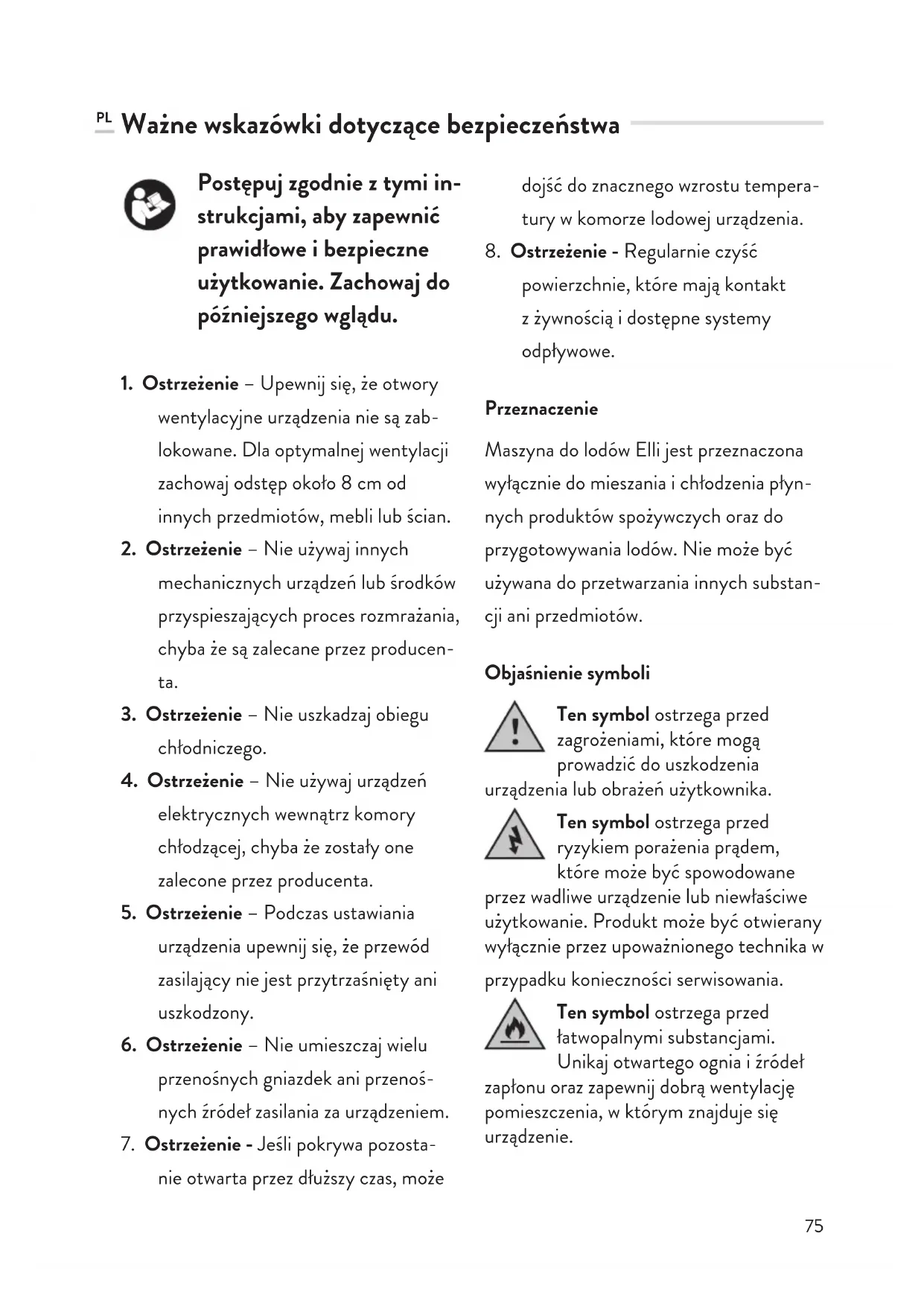 - Maszyna do lodów Elli jest przeznaczona wyłącznie do mieszania i chłodzenia płynnych produktów spożywczych oraz przygotowywania lodów. Nie może być używana do przetwarzania innych substancji ani przedmiotów.