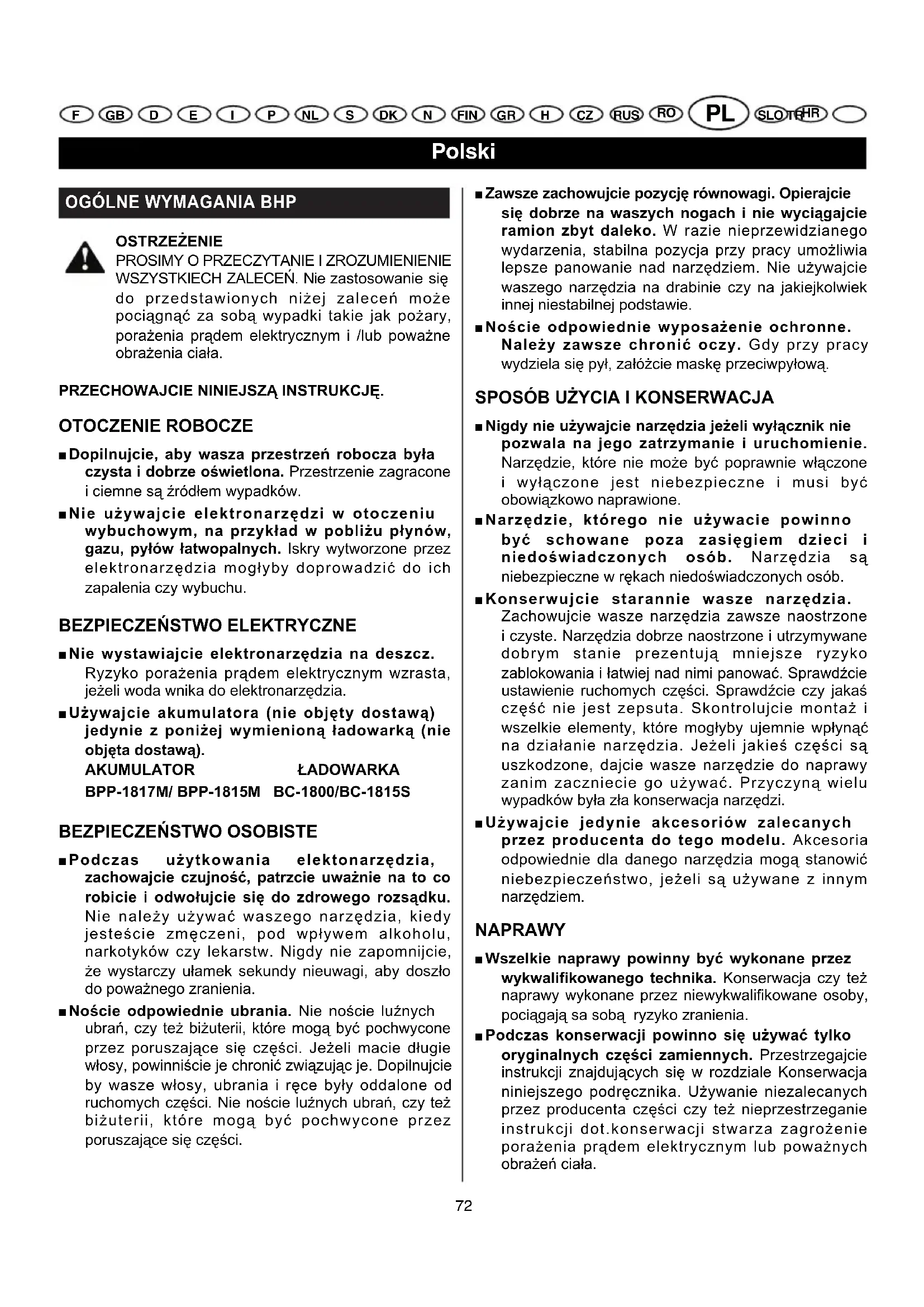 ■ Nie wystawiajcie elektronarzędzia na deszcz. Ryzyko porażenia prądem elektrycznym wzrasta, jeżeli woda wnika do elektronarzędzia. ■ Używajcie akumulatora (nie objęty dostawą) jedynie z poniżej wymienioną ładowarką (nie objęta dostawą). AKUMULATOR ŁADOWARKA BPP-1817M/ BPP-1815M BC-1800/BC-1815S
