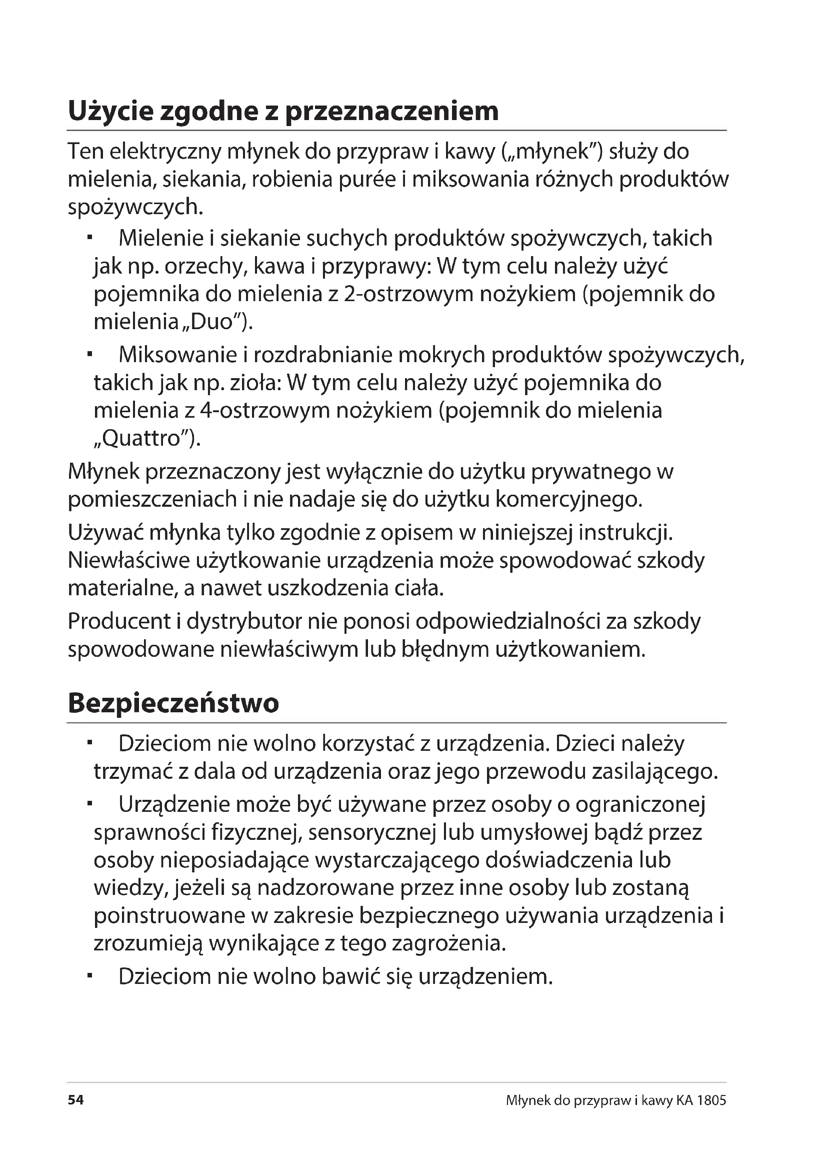 Używać młynka tylko zgodnie z opisem w niniejszej instrukcji. Niewłaściwe użytkowanie urządzenia może spowodować szkody materialne, a nawet uszkodzenia ciała.