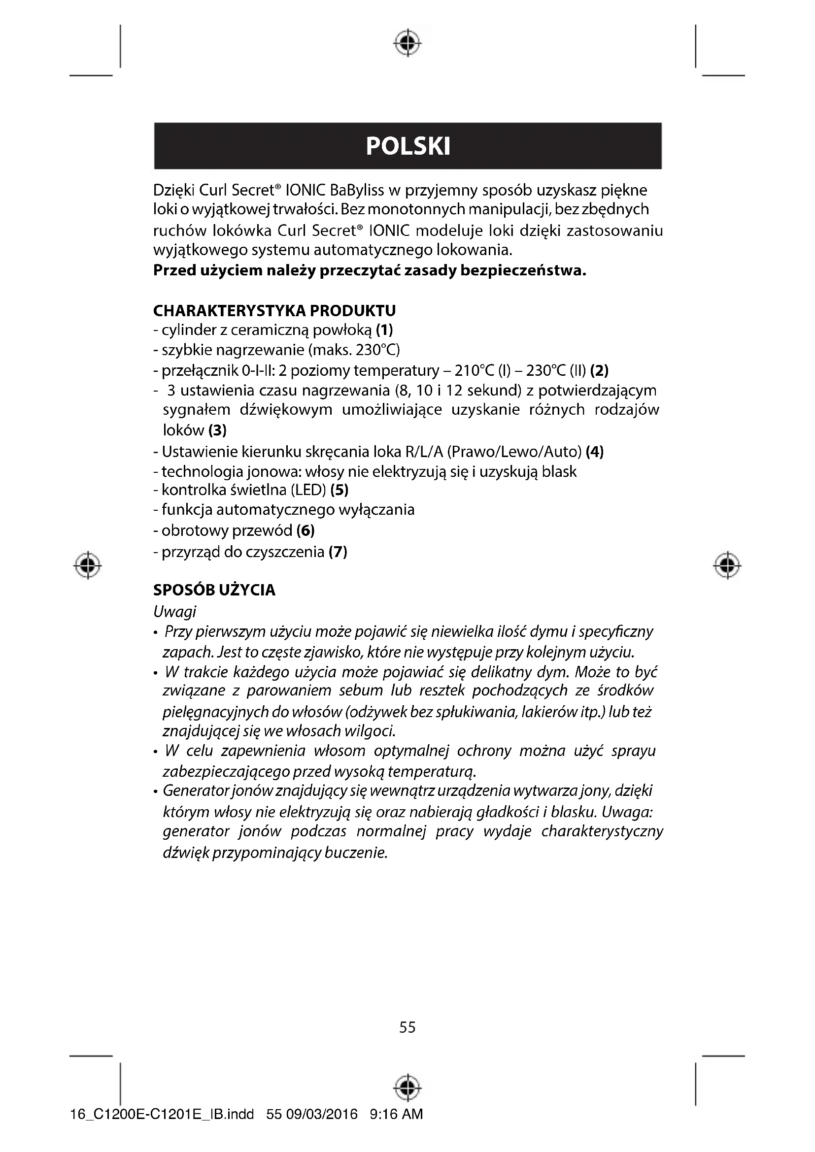 - A tisztító eszköz sokszor felhasználható. Elég csak levenni a lc betétet, kímélő mosószeres vízben elöblíteni, majd megszáradni hagyni az ismételt használat előtt. A készülék burkolatát nedves törlőruhával át lehet törölni, miután a készülék lehűlt, és csatlakozója ki van húzva a konnektorból. Mielőtt újra csatlakoztatná a hálózathoz, győződjön meg róla, hogy teljesen megszáradt. 16_C1200E-C1201E_IB.indd 54 09/03/2016 9:16 AM55 POLSKI Dzięki Curl Secret® IONIC BaByliss w przyjemny sposób uzyskasz piękne loki o wyjątkowej trwałości. Bez monotonnych manipulacji, bez zbędnych ruchów lokówka Curl Secret® IONIC modeluje loki dzięki zastosowaniu wyjątkowego systemu automatycznego lokowania. Przed użyciem należy przeczytać zasady bezpieczeństwa. CHARAKTERYSTYKA PRODUKTU - cylinder z ceramiczną powłoką (1) - szybkie nagrzewanie (maks. 230°C) - przełącznik 0-I-II: 2 poziomy temperatury – 210°C (I) – 230°C (II) (2) - 3 ustawienia czasu nagrzewania (8, 10 i 12 sekund) z potwierdzającym sygnałem dźwiękowym umożliwiające uzyskanie różnych rodzajów loków (3) - Ustawienie kierunku skręcania loka R/L/A (Prawo/Lewo/Auto) (4) - technologia jonowa: włosy nie elektryzują się i uzyskują blask - kontrolka świetlna (LED) (5) - funkcja automatycznego wyłączania - obrotowy przewód (6) - przyrząd do czyszczenia (7)