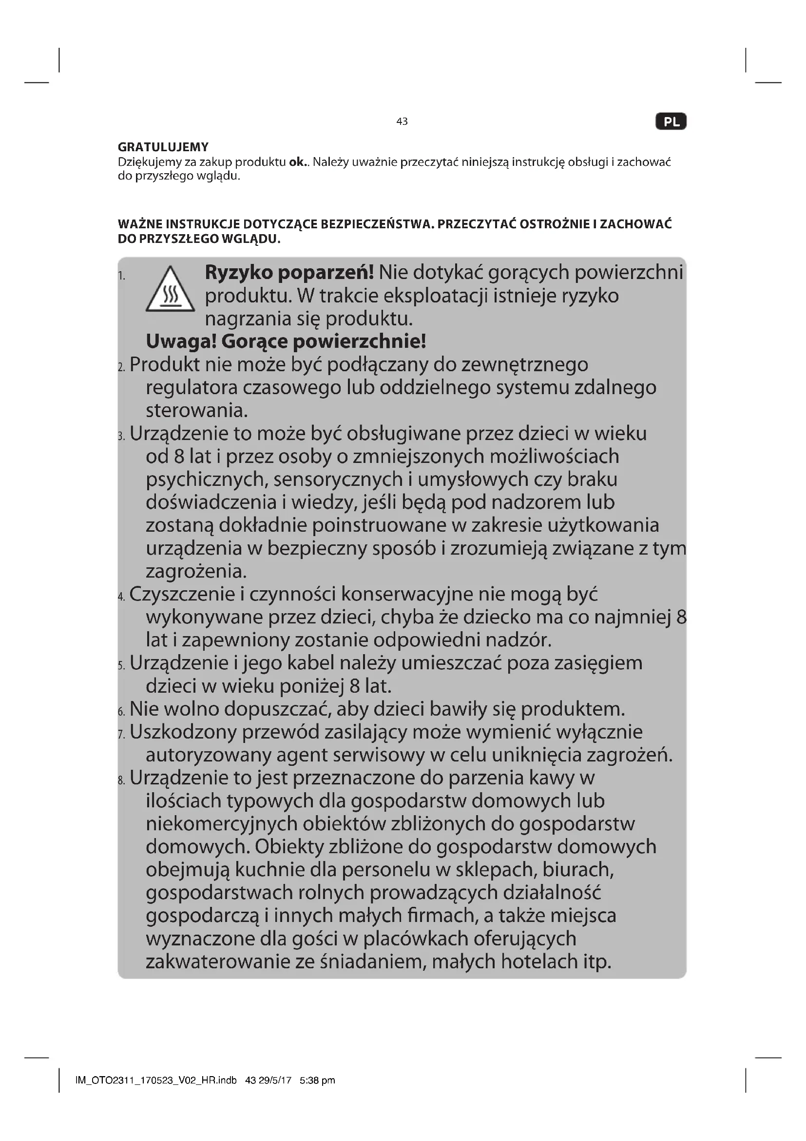 Ryzyko poparzen! Nie dotykać gorących powierzchni produktu. W trakcie eksploataci istnieje ryzykoningrzania są produktu.