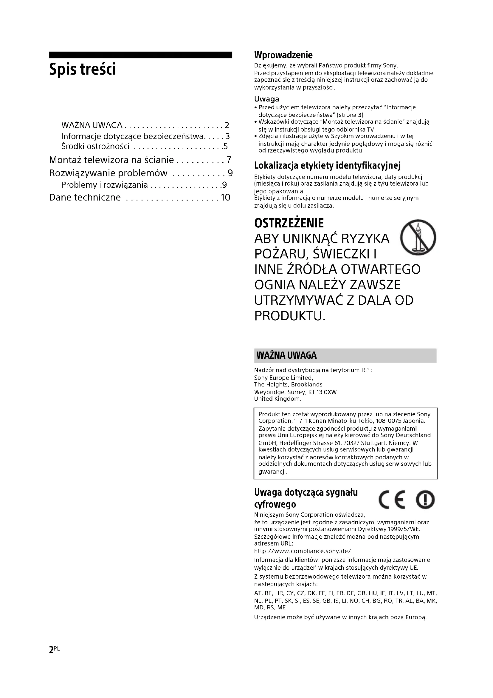 - Dane techniczne Wprowadzenie Dziękujemy, że wybrali Państwo produkt firmy Sony. Przed przystąpieniem do eksploatacji telewizora należy dokładnie zapoznać się z treścią niniejszej instrukcji oraz zachować ją do wykorzystania w przyszłości.Uwaga• Przed użyciem telewizora należy przeczytać “Informacje dotyczące bezpieczeństwa” (strona 3). p. 10