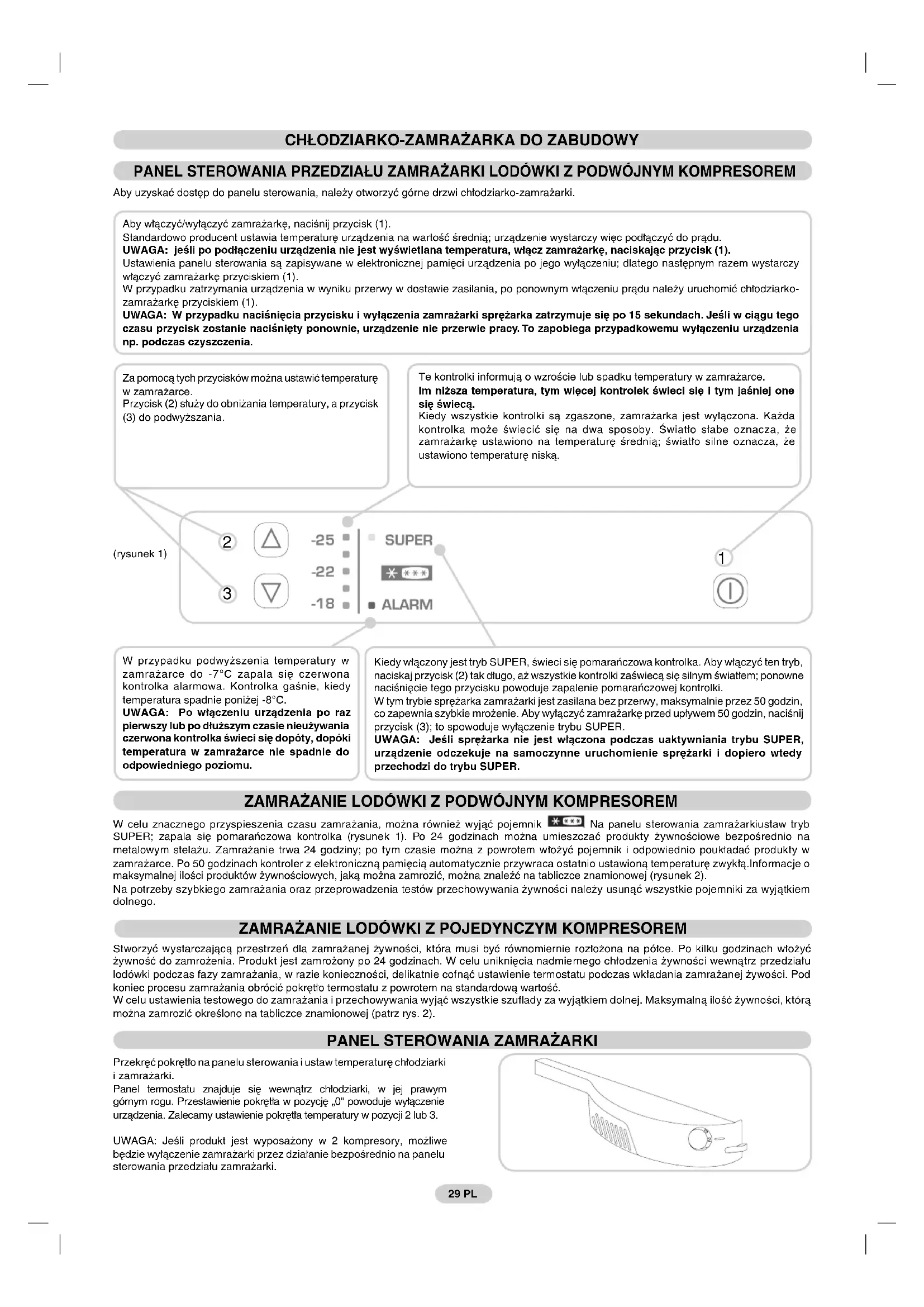 Przekręć pokrętło na panelu sterowania i ustaw temperaturę chłodziarki i zamrażarki. Panel termostatu znajduje się wewnątrz chłodziarki, w jej prawym górnym rogu. Przestawienie pokrętła w pozycję „0" powoduje wyłączenie urządzenia. Zalecamy ustawienie pokrętła temperatury w pozycji 2 lub 3. UWAGA: Jeśli produkt jest wyposażony w 2 kompresory, możliwe będzie wyłączenie zamrażarki przez działanie bezpośrednio na panelu sterowania przedziału zamrażarki. Za pomocą tych przycisków można ustawić temperaturę w zamrażarce. Przycisk (2) służy do obniżania temperatury, a przycisk (3) do podwyższania. W przypadku podwyższenia temperatury w zamrażarce do -7°C zapala się czerwona kontrolka alarmowa. Kontrolka gaśnie, kiedy temperatura spadnie poniżej -8°C. UWAGA: Po włączeniu urządzenia po raz pierwszy lub po dłuższym czasie nieużywania czerwona kontrolka świeci się dopóty, dopóki temperatura w zamrażarce nie spadnie do odpowiedniego poziomu. Kiedy włączony jest tryb SUPER, świeci się pomarańczowa kontrolka. Aby włączyć ten tryb, naciskaj przycisk (2) tak długo, aż wszystkie kontrolki zaświecą się silnym światłem; ponowne naciśnięcie tego przycisku powoduje zapalenie pomarańczowej kontrolki. W tym trybie sprężarka zamrażarki jest zasilana bez przerwy, maksymalnie przez 50 godzin, co zapewnia szybkie mrożenie. Aby wyłączyć zamrażarkę przed upływem 50 godzin, naciśnij przycisk (3); to spowoduje wyłączenie trybu SUPER. UWAGA: Jeśli sprężarka nie jest włączona podczas uaktywniania trybu SUPER, urządzenie odczekuje na samoczynne uruchomienie sprężarki i dopiero wtedy przechodzi do trybu SUPER. 29 PL Te kontrolki informują o wzroście lub spadku temperatury w zamrażarce. Im niższa temperatura, tym więcej kontrolek świeci się i tym jaśniej one się świecą. Kiedy wszystkie kontrolki są zgaszone, zamrażarka jest wyłączona. Każda kontrolka może świecić się na dwa sposoby. Światło słabe oznacza, że zamrażarkę ustawiono na temperaturę średnią; światło silne oznacza, że ustawiono temperaturę niską. Aby włączyć/wyłączyć zamrażarkę, naciśnij przycisk (1). Standardowo producent ustawia temperaturę urządzenia na wartość średnią; urządzenie wystarczy więc podłączyć do prądu. UWAGA: jeśli po podłączeniu urządzenia nie jest wyświetlana temperatura, włącz zamrażarkę, naciskając przycisk (1). Ustawienia panelu sterowania są zapisywane w elektronicznej pamięci urządzenia po jego wyłączeniu; dlatego następnym razem wystarczy włączyć zamrażarkę przyciskiem (1). W przypadku zatrzymania urządzenia w wyniku przerwy w dostawie zasilania, po ponownym włączeniu prądu należy uruchomić chłodziarko- zamrażarkę przyciskiem (1). UWAGA: W przypadku naciśnięcia przycisku i wyłączenia zamrażarki sprężarka zatrzymuje się po 15 sekundach. Jeśli w ciągu tego czasu przycisk zostanie naciśnięty ponownie, urządzenie nie przerwie pracy. To zapobiega przypadkowemu wyłączeniu urządzenia np. podczas czyszczenia.