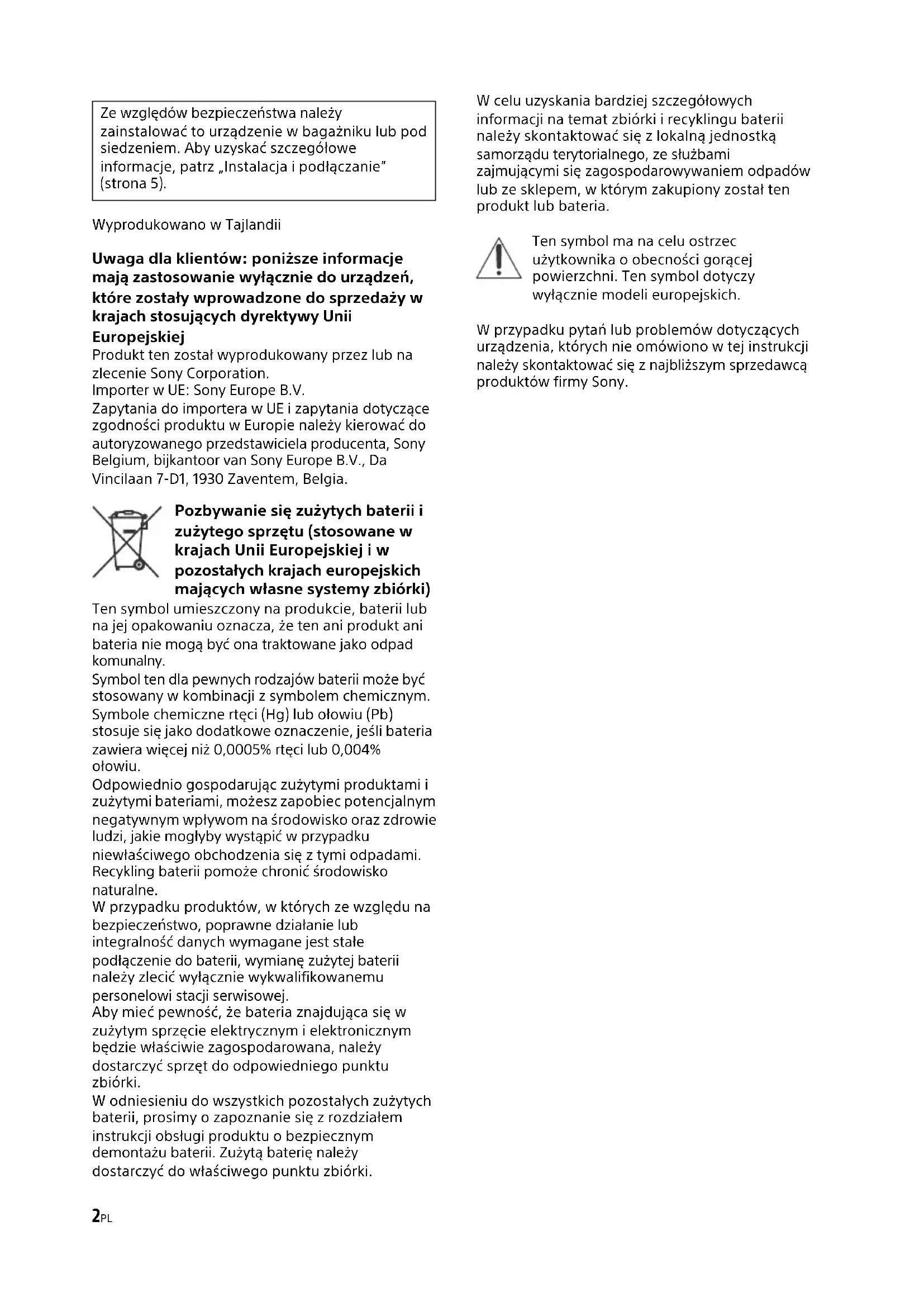 conectar o alto-falante full range, configure como “OFF” ou “HP”. O som está muito baixo. O controle de ajuste LEVEL não é apropriado. Gire o controle de ajuste LEVEL no sentido horário. Se essas soluções não ajudarem a melhorar a situação , consulte o revendedor Sony mais próximo.2PL Wyprodukowano w Tajlandii Uwaga dla klientów: poniższe informacje mają zastosowanie wyłącznie do urządzeń, które zostały wprowadzone do sprzedaży w krajach stosujących dyrektywy Unii Europejskiej Produkt ten został wyprodukowany przez lub na zlecenie Sony Corporation. Importer w UE: Sony Europe B.V. Zapytania do importera w UE i zapytania dotyczące zgodności produktu w Europie należy kierować do autoryzowanego przedstawiciela producenta, Sony Belgium, bijkantoor van Sony Europe B.V., Da Vincilaan 7-D1, 1930 Zaventem, Belgia. Pozbywanie się zużytych baterii i zużytego sprzętu (stosowane w krajach Unii Europejskiej i w pozostałych krajach europejskich mających własne systemy zbiórki) Ten symbol umieszczony na produkcie, baterii lub na jej opakowaniu oznacza, że ten ani produkt ani bateria nie mogą być ona traktowane jako odpad komunalny. Symbol ten dla pewnych rodzajów baterii może być stosowany w kombinacji z symbolem chemicznym. Symbole chemiczne rtęci (Hg) lub ołowiu (Pb) stosuje się jako dodatkowe oznaczenie, jeśli bateria zawiera więcej niż 0,0005% rtęci lub 0,004% ołowiu. Odpowiednio gospodarując zużytymi produktami i zużytymi bateriami, możesz zapobiec potencjalnym negatywnym wpływom na środowisko oraz zdrowie ludzi, jakie mogłyby wystąpić w przypadku niewłaściwego obchodzenia się z tymi odpadami. Recykling baterii pomoże chronić środowisko naturalne. W przypadku produktów, w których ze względu na bezpieczeństwo, poprawne działanie lub integralność danych wymagane jest stałe podłączenie do baterii, wymianę zużytej baterii należy zlecić wyłącznie wykwalifikowanemu personelowi stacji serwisowej. Aby mieć pewność, że bateria znajdująca się w zużytym sprzęcie elektrycznym i elektronicznym będzie właściwie zagospodarowana, należy dostarczyć sprzęt do odpowiedniego punktu zbiórki. W odniesieniu do wszystkich pozostałych zużytych baterii, prosimy o zapoznanie się z rozdziałem instrukcji obsługi produktu o bezpiecznym demontażu baterii. Zużytą baterię należy dostarczyć do właściwego punktu zbiórki. W celu uzyskania bardziej szczegółowych informacji na temat zbiórki i recyklingu baterii należy skontaktować się z lokalną jednostką samorządu terytorialnego, ze służbami zajmującymi się zagospodarowywaniem odpadów lub ze sklepem, w którym zakupiony został ten produkt lub bateria. Ten symbol ma na celu ostrzec użytkownika o obecności gorącej powierzchni. Ten symbol dotyczy wyłącznie modeli europejskich. W przypadku pytań lub problemów dotyczących urządzenia, których nie omówiono w tej instrukcji należy skontaktować się z najbliższym sprzedawcą produktów firmy Sony. Ze względów bezpieczeństwa należy zainstalować to urządzenie w bagażniku lub pod siedzeniem. Aby uzyskać szczegółowe informacje, patrz „Instalacja i podłączanie” (strona 5).3PL Cechy charakterystyczne Maksymalna moc wyjściowa to 150 W na kanał (przy 4 Ω). To urządzenie może służyć jako wzmacniacz mostkow y o maksymalnej mocy wyjściowej 350 W. Wbudowany filtr LP (dolnoprzepustowy), HP (górno przepustowy), poddźwiękowy oraz obwód wzmocnienia niskich częstotliwości. Wbudowany obwód i wskaźnik zabezpieczający. Można dokonać bezpośredniego połączenia z wyjściem głośnika w samochodowym zestawie audio, jeśli nie jest on wyposażony w wyjście liniowe (połączenie wejścia wysokiego poziomu).
