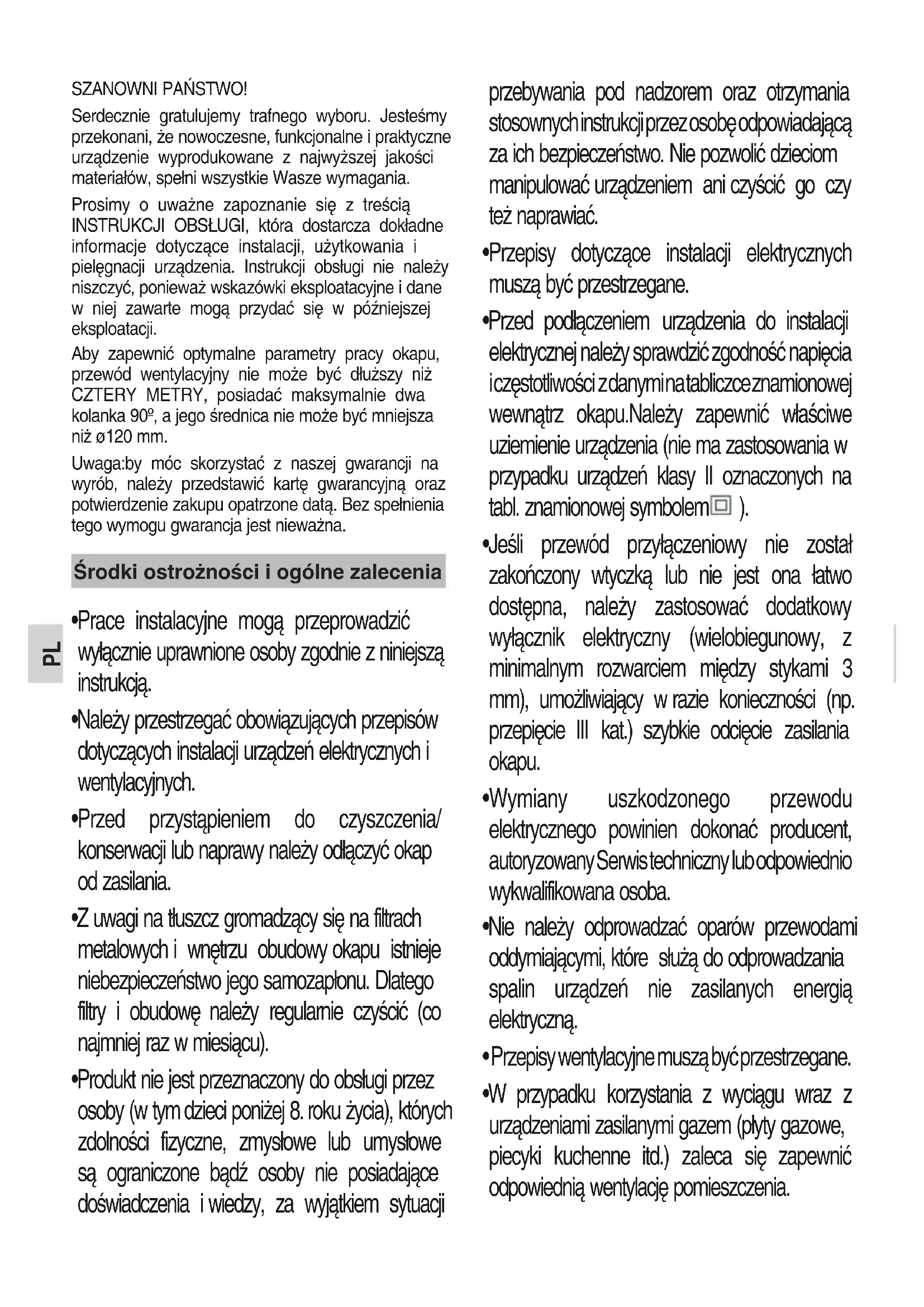 - W przypadku korzystania z wyciągu wraz z urządzeniami zasilanymi gazem (płyty gazowe, piecyki kuchenne itd.) zaleca się zapewnić odpowiednią wentylację pomieszczenia. Środki ostrożności i ogólne zaleceniaPL