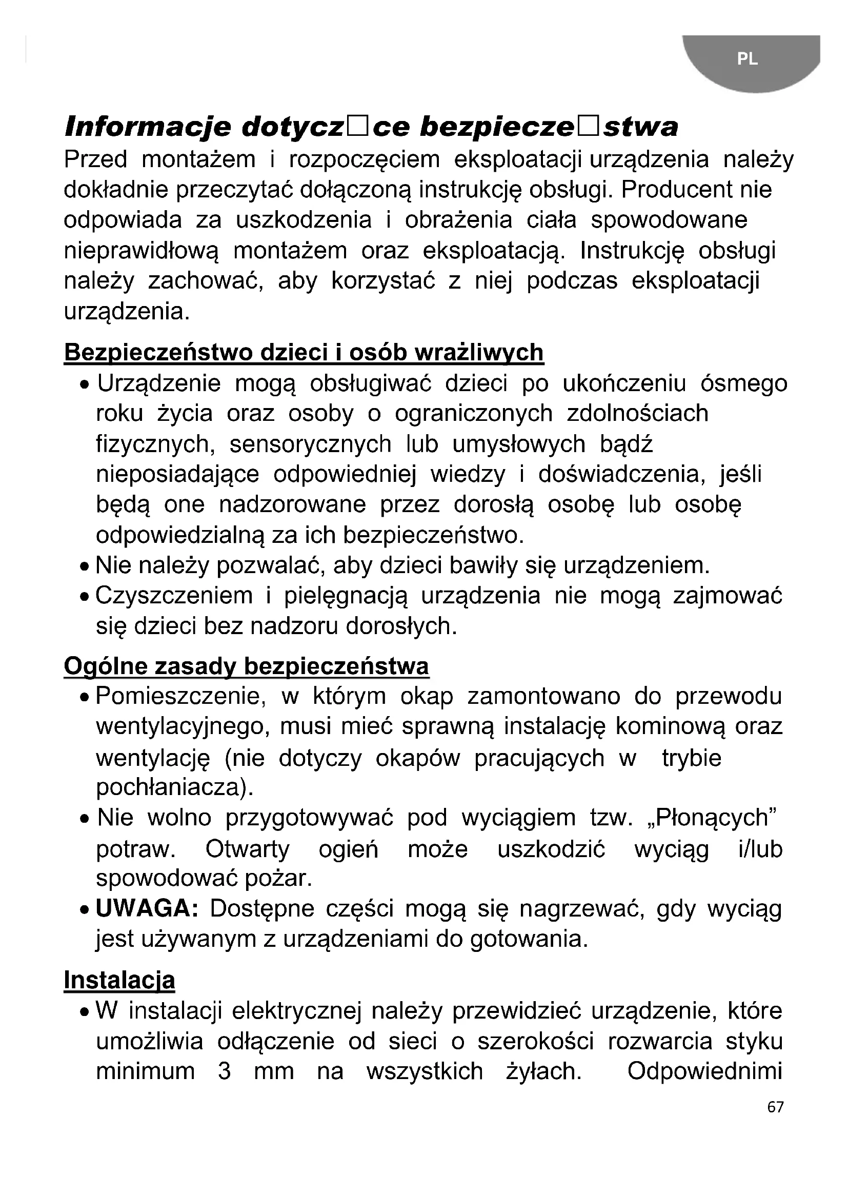 Informacje dotyczČce bezpieczeČstwa Przed montażem i rozpoczęciem eksploatacji urządzenia należy dokładnie przeczytać dołączoną instrukcję obsługi. Producent nie odpowiada za uszkodzenia i obrażenia ciała spowodowane nieprawidłową montażem oraz eksploatacją. Instrukcję obsługi należy zachować, aby korzystać z niej podczas eksploatacji urządzenia. Bezpieczeństwo dzieci i osób wrażliwych Urządzenie mogą obsługiwać dzieci po ukończeniu ósmego roku życia oraz osoby o ograniczonych zdolnościach fizycznych, sensorycznych lub umysłowych bądź nieposiadające odpowiedniej wiedzy i doświadczenia, jeśli będą one nadzorowane przez dorosłą osobę lub osobę odpowiedzialną za ich bezpieczeństwo. Nie należy pozwalać, aby dzieci bawiły się urządzeniem. Czyszczeniem i pielęgnacją urządzenia nie mogą zajmować się dzieci bez nadzoru dorosłych. Ogólne zasady bezpieczeństwa Pomieszczenie, w którym okap zamontowano do przewodu wentylacyjnego, musi mieć sprawną instalację kominową oraz wentylację (nie dotyczy okapów pracujących w trybie pochłaniacza). Nie wolno przygotowywać pod wyciągiem tzw. „Płonących” potraw. Otwarty ogień może uszkodzić wyciąg i/lub spowodować pożar. UWAGA: Dostępne części mogą się nagrzewać, gdy wyciąg jest używanym z urządzeniami do gotowania. Instalacja W instalacji elektrycznej należy przewidzieć urządzenie, które umożliwia odłączenie od sieci o szerokości rozwarcia styku minimum 3 mm na wszystkich żyłach. Odpowiednimi68 urządzeniami rozdzielającymi są np. wyłączniki LS, wyłączniki ochronne prądowe i styczniki. Jeśli dokonano podłączenia elektrycznego poprzez wtyczkę oraz jest ona łatwo dostępna, to nie ma konieczności montażu dodatkowego urządzenia rozdzielającego. Nie podłączać okapu do kanału kominowego, do którego podłączono urządzenia grzewcze opalane gazem lub innym paliwem (nie dotyczy okapów pracujących w trybie pochłaniacza). Dolna powierzchnia okapu powinna znajdować się co najmniej 60 cm nad palnikami elektrycznymi lub 65 cm nad palnikami gazowymi. W czasie prac montażowych należy przestrzegać obowiązujących przepisów dotyczących wentylacji i oddymiania pomieszczeń. Kiedy jednak uruchamią się wyciąg wraz z innymi urządzeniami niezasilanymi energią elektryczną, ciśnienie powietrza na wyjściu nie może przekraczać 4 Pa (4x10-5 bar). Przed przyłączeniem urządzenia do instalacji elektrycznej należy sprawdzić zgodność napięcia i częstotliwości z danymi na tabliczce znamionowej. Wyciąg powinien być podłączony do gniazdka z uziemieniem. W celu uzyskania optymalnego odprowadzenia powietrza, przewód nie powinien być dłuższy niż 4 metry i powinien posiadać maksymalnie dwa kolanka 90º. W przypadku braku możliwości odprowadzania oparów na zewnątrz, należy zainstalować filtr z węgla aktywnego. Filtr montuje się w korpusie wyciągu, poprzez wkręcanie go w kierunku zgodnym z ruchem wskazówek zegara. UWAGA: Aby uzyskać więcej informacji na temat instalacji znajdują się na końcu niniejszej instrukcji obsługi.69