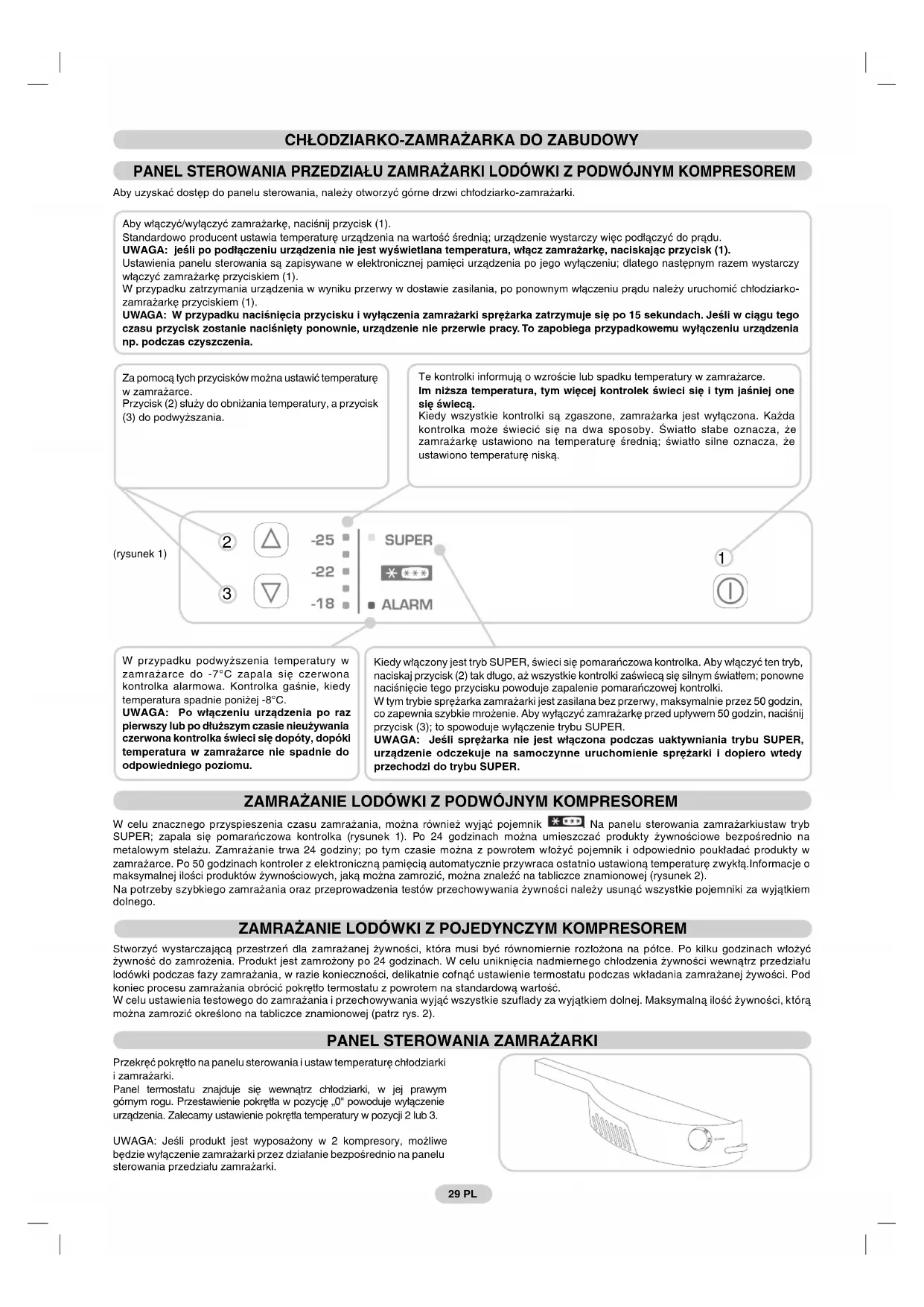 ZAMRAŻANIE LODÓWKI Z PODWÓJNYM KOMPRESOREM W celu znacznego przyspieszenia czasu zamrażania, można również wyjąć pojemnik . Na panelu sterowania zamrażarkiustaw tryb SUPER; zapala się pomarańczowa kontrolka (rysunek 1). Po 24 godzinach można umieszczać produkty żywnościowe bezpośrednio na metalowym stelażu. Zamrażanie trwa 24 godziny; po tym czasie można z powrotem włożyć pojemnik i odpowiednio poukładać produkty w zamrażarce. Po 50 godzinach kontroler z elektroniczną pamięcią automatycznie przywraca ostatnio ustawioną temperaturę zwykłą.Informacje o maksymalnej ilości produktów żywnościowych, jaką można zamrozić, można znaleźć na tabliczce znamionowej (rysunek 2). Na potrzeby szybkiego zamrażania oraz przeprowadzenia testów przechowywania żywności należy usunąć wszystkie pojemniki za wyjątkiem dolnego.
