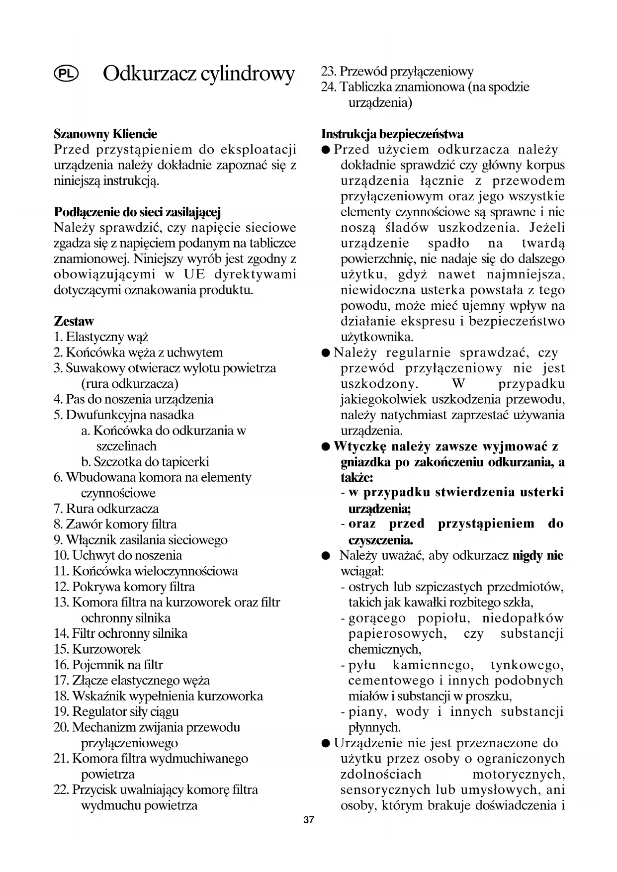 Odkurzacz cylindrowy stosownej wiedzy, chyba że są one pod nadzorem osoby odpowiedzialnej za ich bezpieczeństwo, która instruuje jak bezpiecznie korzystać z urządzenia. ● Specjalnej ostrożności wymaga używanie wszelkich urządzeń elektrycznych w obecności dzieci, które powinny znajdować się w bezpiecznej od nich odległości. ● Przed podłączeniem urządzenia do prądu zawsze należy upewnić się, czy kurzoworek nie jest uszkodzony. Nie należy używać odkurzacza, jeśli: - w odkurzaczu nie ma kurzoworka, albo jest on uszkodzony, - wskaźnik wypełnienia kurzoworka wskazuje, iż osiągnął on już maksymalne wypełnienie. ● Odkurzaczem nie wolno czyścić zwierząt, ani ludzi. Wszelki kontakt oczu lub uszu z elementami czynnościowymi odkurzacza wiąże się z dużym ryzykiem. Należy więc elementy odkurzacza zawsze trzymać w bezpiecznej odległości od głowy. ● Przy wyjmowaniu wtyczki z gniazdka elektrycznego nigdy nie należy ciągnąć za przewód. ● Za szkody wynikłe z nieprawidłowego używania sprzętu lub użytkowania niezgodnego z instrukcją obsługi odpowiedzialność ponosi wyłącznie użytkownik. ● Urządzenie to przeznaczone jest do użytku domowego a nie komercjalnego. ● Zgodnie z regulaminem bezpieczeństwa i w celu uniknięcia ryzyka, wszelkie naprawy urządzeń elektrycznych muszą być dokonywane przez wykwalifikowany i upoważniony do tego personel. Dotyczy to również wymiany przewodu przyłączeniowego. Jeśli urządzenie wymaga naprawy, prosimy wysłać je do jednego z naszych działów obsługi klienta. Odpowiednie adresy znajdują się w karcie gwarancyjnej w języku polskim. Przed przystąpieniem do uruchomienia urządzenia