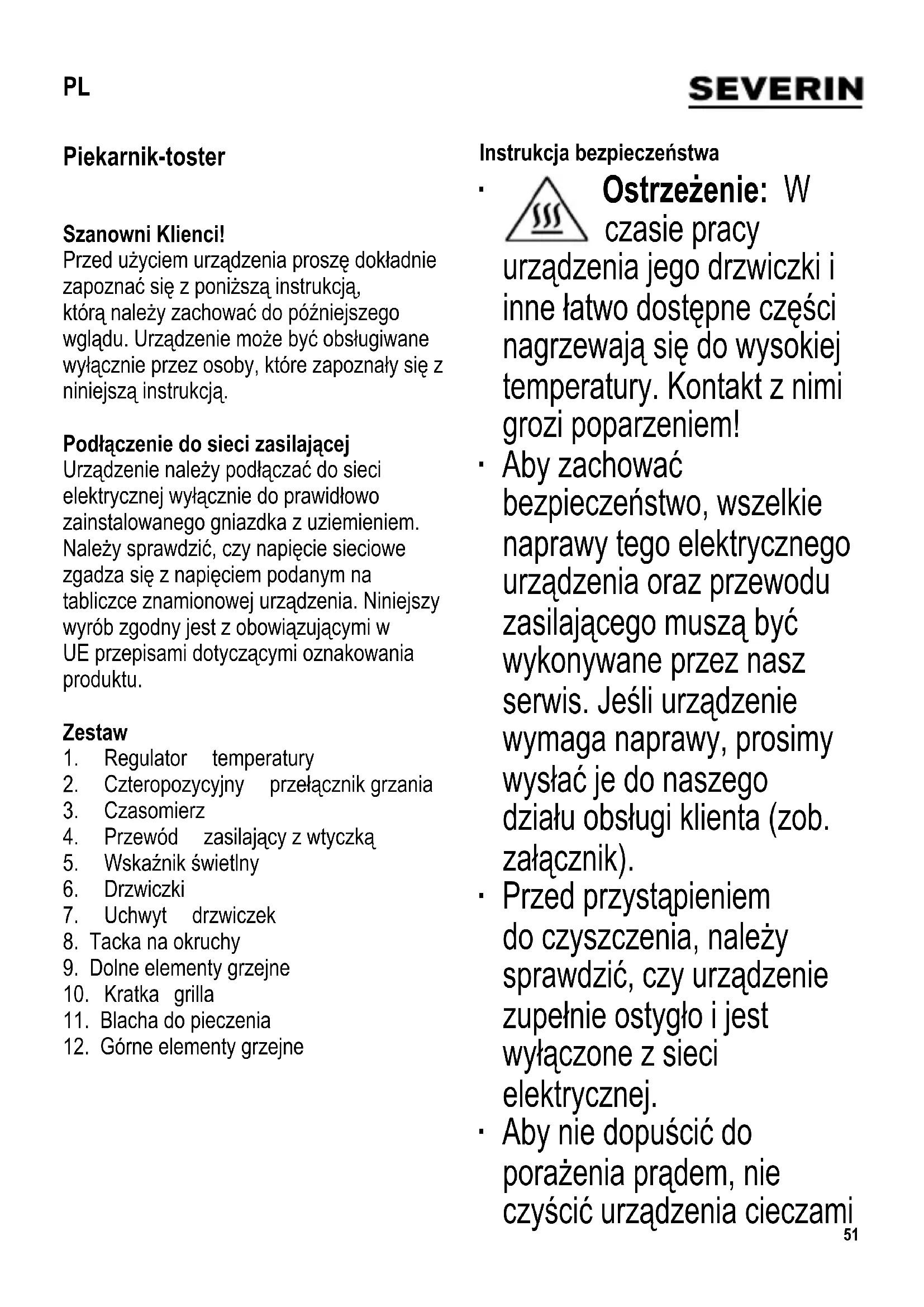 Instrukcja bezpieczeństwa ∙ Ostrzeżenie: W czasie pracy urządzenia jego drzwiczki i inne łatwo dostępne części nagrzewają się do wysokiej temperatury. Kontakt z nimi grozi poparzeniem! ∙ Aby zachować bezpieczeństwo, wszelkie naprawy tego elektrycznego urządzenia oraz przewodu zasilającego muszą być wykonywane przez nasz serwis. Jeśli urządzenie wymaga naprawy, prosimy wysłać je do naszego działu obsługi klienta (zob. załącznik). ∙ Przed przystąpieniem do czyszczenia, należy sprawdzić, czy urządzenie zupełnie ostygło i jest wyłączone z sieci elektrycznej. ∙ Aby nie dopuścić do porażenia prądem, nie czyścić urządzenia cieczami PL52 ani nie zanurzać go. ∙ Po użyciu urządzania zawsze należy je wyczyścić. Szczegółowe informacje na ten temat znajdują się w punkcie Czyszczenie i konserwacja. ∙ Urządzenie nie jest przystosowane do bycia uruchamianym przy użyciu zewnętrznego czasomierza lub odrębnego systemu zdalnego sterowania. ∙ Urządzenie przeznaczone jest do zastosowań domowych lub podobnych, jak np. w - kuchniach biurowych lub innych miejscach pracy; - agroturystyce; - hotelach, motelach itp. oraz innych podobnych lokalach (przez klientów); - pensjonatach. ∙ Osoby o ograniczonych zdolnościach fi zycznych, czuciowych lub psychicznych albo nieposiadające stosownego doświadczenia lub wiedzy, a także dzieci (w wieku co najmniej 8 lat), mogą korzystać z urządzenia, pod warunkiem że znajdują się pod nadzorem lub zostały poinstruowane, jak używać urządzenia i są w pełni świadome wszelkich zagrożeń i wymaganych środków ostrożności. ∙ Nie dopuszczać do używania urządzenia jako zabawki przez dzieci. ∙ Nie wolno pozwalać dzieciom na wykonywanie jakichkolwiek prac związanych bezpośrednio z konserwacją lub czyszczeniem urządzenia, a jeżeli już, to dziecko musi mieć co najmniej 8 lat i być nadzorowane przez osobę dorosłą. ∙ Nie dopuszczać do53 urządzenia i jego przewodu zasilającego dzieci poniżej 8 lat. ∙ Ostrzeżenie: Nie pozwalać, aby dzieci miały dostęp do elementów opakowania, ponieważ mogą one spowodować zagrożenie, np. uduszenia. ∙ Przed użyciem należy dokładnie sprawdzić, czy główny korpus urządzenia i wszystkie elementy czynnościowe są sprawne i nie noszą śladów uszkodzenia. Jeżeli urządzenie np. spadło na twardą powierzchnię albo przewód zasilający został narażony na zbyt silne szarpnięcie, nie nadaje się ono do dalszego użytku: nawet najmniejsza, niewidoczna usterka powstała z tego powodu, może mieć ujemny wpływ na działanie urządzenia i bezpieczeństwo użytkownika. ∙ Nie dotykać elementów grzejnych. ∙ Przed rozpoczęciem użytkowania urządzenia należy założyć pod dolnymi elementami grzejnymi tackę na okruchy. ∙ Rozgrzany olej może się łatwo zapalić. Dlatego nie należy przepełniać blachy do pieczenia. Pozwoli to zapobiec skapywaniu tłuszczu na dolne elementy grzejne. ∙ W trakcie pracy urządzenia, blacha musi zawsze znajdować się na kratce grilla. ∙ Podczas używania i czyszczenia blachy do pieczenia nie stosować ostrych ani trących narzędzi. ∙ Nie zostawiać włączonego urządzenia bez nadzoru. ∙ Nie używać urządzenia na wolnym powietrzu. ∙ Należy zapewnić dostateczny stały przepływ powietrza. Na kuchence nie należy kłaść żadnych przedmiotów, a ponadto należy zapewnić, by wolna przestrzeń wokół urządzenia była nie mniejsza niż podano poniżej: Po bokach: 12 cm Z tyłu: 12 cm Z góry: 30 cm ∙ Nie należy usuwać podstawek znajdujących się na spodniej płycie. Urządzenia nie wolno instalować wewnątrz szafki, bezpośrednio pod płytą lub szafką. ∙ Nie wyjmować stopek, na których stoi piekarnik. ∙ Nie należy używać urządzenia w pobliżu półek ściennych lub pod przedmiotami wiszącymi takimi jak fi ranki czy inne łatwopalne tworzywa. ∙ Podczas pracy urządzenie musi być ustawione na powierzchni odpornej na wysokie temperatury i odpryski tłuszczu. Nie należy ustawiać urządzenia na, lub w pobliżu, gorących powierzchni, otwartego ognia lub łatwopalnych oparów. ∙ Należy uważać, aby przewód zasilający nie dotykał żadnych gorących elementów. ∙ Nie należy pozostawiać przewodu zasilającego swobodnie zwisającego. ∙ Wtyczkę należy wyjąć z gniazdka elektrycznego każdorazowo: - po zakończeniu pracy - w przypadku awarii urządzenia - przed przystąpieniem do czyszczenia urządzenia. ∙ Wyjmując wtyczkę z gniazdka nigdy nie należy szarpać za przewód. ∙ Za szkody wynikłe z nieprawidłowego używania sprzętu lub użytkowania niezgodnego z instrukcją obsługi winę ponosi wyłącznie użytkownik.54 Regulator temperatury Gałką regulatora temperatury wybieramy odpowiednią moc grzania. Pięciopozycyjny przełącznik grzania Obydwa elementy grzejne wyłączone Górny element Dolny element Górny i dolny element Elementy grzejne włączają się dopiero po nastawieniu czasomierza. Czasomierz ∙ Czas przygotowywania można nastawić przy pomocy czasomierza (maksymalnie 60 min). ∙ Aby ustawić czas pracy, przekręcić gałkę czasomierza do żądanej wartości. ∙ Aby ustawić czas pracy krótszy niż 10 minut, najpierw przekręcić czasownik na nieco wyższą pozycję, po czym powoli przekręcić go z powrotem do żądanego ustawienia. Po upływie zaprogramowanego czasu słychać będzie sygnał dźwiękowy, który informuje o wyłączeniu się elementów grzejnych. Wskaźnik świetlny Wskaźnik świetlny zapala się, kiedy urządzenie jest włączone. Gaśnie, kiedy upłynie zaprogramowany czas pracy lub kiedy pokrętło zostanie ustawione w pozycji . Uruchomienie urządzenia ∙ Urządzenie należy wyczyścić według instrukcji Czyszczenie i konserwacja, a także usunąć wszelkie elementy opakowania (w tym także wszystkie naklejki, jeżeli są). ∙ Przed pierwszym użyciem urządzenia należy je najpierw rozgrzewać przez 