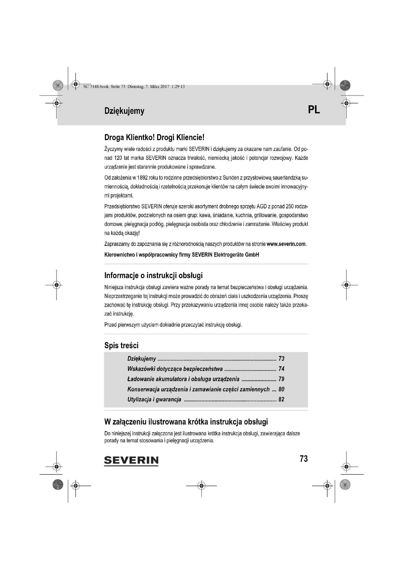 Zyczym wie radosci z produktu marki SEVERIN i;dziekujemy za okazane nam zaufanie. Od ponad 120 lat marka SEVERIN oznacza trwalosc, niemiecka jakosc i potencjal rozwojny. Kaźde urzadzenia jest starannie produktowane i sprawdzane.