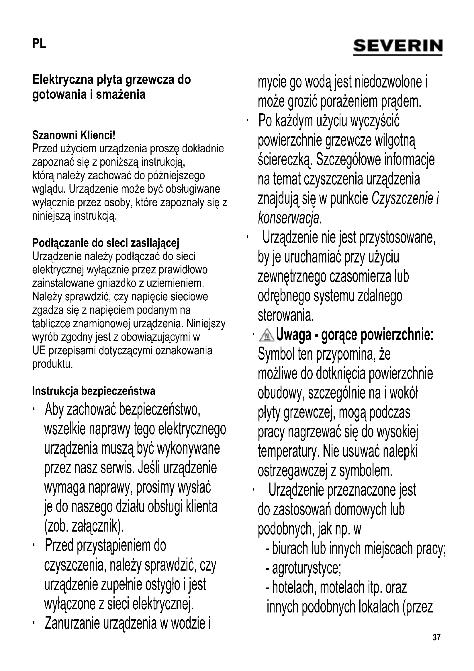 ∙ Nie dopuszczać do urządzenia i jego przewodu zasilającego dzieci poniżej 8 lat. ∙ Uwaga! Nie pozwalać, aby dzieci miały dostęp do elementów opakowania, ponieważ może to doprowadzić do niebezpiecznego wypadku, np. uduszenia. ∙ Przed użyciem należy dokładnie sprawdzić, czy główny korpus urządzenia i wszystkie elementy czynnościowe są sprawne i nie noszą śladów uszkodzenia. Jeżeli urządzenie np. spadło na twardą powierzchnię albo przewód zasilający został narażony na zbyt silne szarpnięcie, nie nadaje się ono do dalszego użytku: nawet najmniejsza, niewidoczna usterka powstała z tego powodu, może mieć ujemny wpływ na działanie urządzenia i bezpieczeństwo użytkownika. ∙ Nie zostawiać włączonego urządzenia bez nadzoru. ∙ Uwaga: W przypadku przegrzania żywności, może się ona zapalić. Niebezpieczeństwo zapalenia zwiększa się w przypadku produktów z dużą zawartością tłuszczu lub oleju. ∙ Nie należy używać urządzenia w pobliżu półek ściennych lub pod przedmiotami wiszącymi takimi jak fi ranki czy inne łatwopalne tworzywa. ∙ Podczas pracy urządzenie musi być ustawione na powierzchni odpornej na wysokie temperatury, odpryski tłuszczu i gorącą parę. Zadbać o możliwość swobodnej cyrkulacji powietrza pod urządzeniem. Zachować odległość co najmniej 10 cm od jakichkolwiek ścian i przegród. ∙ W trakcie pracy urządzenia otwory wentylacyjne znajdujące się pod spodem nie mogą być zasłonięte. ∙ Wtyczkę należy wyjąć z gniazda elektrycznego: - w przypadku stwierdzenia usterki39 urządzenia; - po zakończeniu pracy; - i przed przystąpieniem do czyszczenia. ∙ Nigdy nie należy ciągnąć za przewód przy wyjmowaniu wtyczki z gniazdka. ∙ Nie pozostawiać przewodu zasilającego swobodnie zwisającego. ∙ Należy uważać aby przewód przyłączeniowy nie dotykał żadnych gorących części. ∙ Za szkody wynikłe z nieprawidłowego używania sprzętu lub użytkowania niezgodnego z instrukcją obsługi odpowiedzialność ponosi wyłącznie użytkownik. Uruchomienie Przed pierwszym użyciem rozgrzewać urządzenie przez około 3 minuty, nastawiwszy je na maksymalną temperaturę (lecz bez żadnych naczy ń), zapewniając przy tym odpowiednią wentylację. Podczas tego procesu może wydobywać się lekki zapach spalenizny i dym. Jest to zupełnie normalne i potrwa tylko chwilę. Należy zapewnić w pomieszczeniu odpowiednią wentylację, otwierając okna lub drzwi balkonowe. Urządzenie należy czyścić według opisu w punkcie Czyszczenie i konserwacja poniżej. Obsługa ∙ Garnek do gotowania lub patelnię należy postawić na płycie przed jej włączeniem. ∙ Sprawdzić, czy naczynie do gotowania lub patelnia są czyste i suche po zewnętrznej stronie. Nie używać naczyń i patelni przypalonych i pokrytych plamami. ∙ Aby zapobiec niszczeniu płyty, stawiać na nią tylko naczynia lub patelnie o płaskim dnie. Najlepiej używa ć naczyń specjalnie przeznaczonych do płyt elektrycznych (patrz rysunek I). ∙ U żywane naczynie powinno mieć średnicę przynajmniej taką jak średnica płyty; zmniejsza to utratę ciepła oraz zapobiega niszczeniu się płyty w wyniku nierównej dystrybucji ciepła. Ustawienia termostatu MAX : Podgotowanie i smażenie „na szybko” 4-5 : Normalne gotowanie, smażenie 3-4 : Gotowanie na małym ogniu 1-2 : Podgrzewanie Po zakończeniu pracy, ustawić termostat w pozycji MIN. Aby mieć absolutną pewność, że urządzenie zostało całkowicie odłączone od zasilania, wyjąć wtyczkę z gniazdka elektrycznego. Wskaźnik świetlny Wskaźnik świeci, kiedy płyta się rozgrzewa. Po osiągni ęciu przez płytę żądanej temperatury, wskaźnik gaśnie. Czyszczenie i konserwacja ∙ Przed przystąpieniem do czyszczenia, należy sprawdzić, czy urządzenie całkowicie ostygło i jest wyłączone z sieci elektrycznej. ∙ Nie zanurzać sprzętu w wodzie, ani nie myć go wodą, ponieważ grozi to porażeniem prądem. ∙ Do czyszczenia nie należy stosować żrących roztworów, ani środków ścierających. ∙ Po zakończeniu pracy urządzenia, wszelkie plamy można usunąć z płyty za pomocą mokrej ściereczki.40 ∙ Co jakiś czas należy wyczyścić płytę za pomocą specjalnego środka przeznaczonego do tego celu. Utylizacja Urządzenia oznaczone powyższym symbolem należy usuwać osobno, a nie wraz ze zwykłymi odpadkami z gospodarstwa domowego. Urządzenia takie zawierają bowiem cenne materiały, jakie można poddać recyklingowi. Odpowiednia utylizacja takich urządzeń przyczynia się do ochrony środowiska i zdrowia ludzkiego. Szczegółowych informacji na ten temat udzielają lokalne władze lub sklepy prowadzące sprzedaż detaliczną. Gwarancja Gwarancja na produkt obejmuje wady materiału i wykonania przez okres dwóch lat od daty zakupu produktu. W ramach gwarancji producent zobowiązuje się do naprawy lub wymiany wszelkich wadliwych elementów, pod warunkiem, że produkt zostanie odniesiony prze klienta do punktu zakupu, a później odesłany przez sklep do serwisu centralnego w Opolu, prowadzonego przez fi rmę Serv- Serwis Sp.z o.o. Aby gwarancja zachowała ważno ść, urządzenie musi być używane zgodnie z instrukcją i nie może być modyfi kowane, naprawiane lub w jakikolwiek sposób naruszane przez nieupoważnioną do tego osobę, ani też uszkodzone w wyniku nieprawidłowego użycia. Gwarancja nie obejmuje naturalnego zużycia, ani elementów łatwo tłukących się, jak szkło, elementy z tworzyw sztucznych, żarówki itd. Niniejsza gwarancja nie ogranicza ustawowych praw konsumenta ani innych praw, jakie konsument posiada zgodnie z obowiązującymi przepisami, które dotyczą zakupu przedmiotów użytkowych. Jeżeli urządzenie przestanie działać prawidłowo i musi zostać odesłane, należy je dokładnie zapakować i dołączyć imię, nazwisko i adres nadawcy oraz przyczynę odesłania. Jeśli urządzenie jest nadal na gwar