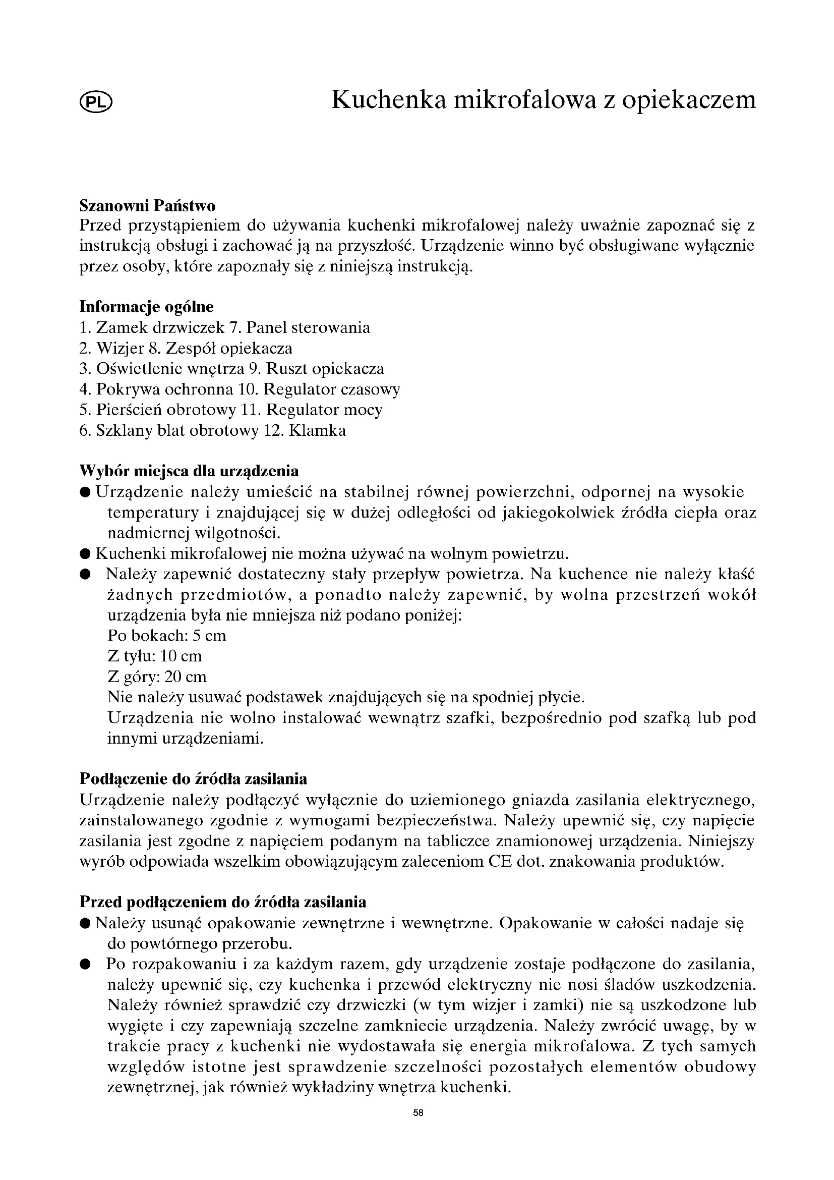 Wybór miejsca dla urządzenia ● Urządzenie należy umieścić na stabilnej równej powierzchni, odpornej na wysokie temperatury i znajdującej się w dużej odległości od jakiegokolwiek źródła ciepła oraz nadmiernej wilgotności. ● Kuchenki mikrofalowej nie można używać na wolnym powietrzu. ● Należy zapewnić dostateczny stały przepływ powietrza. Na kuchence nie należy kłaść żadnych przedmiotów, a ponadto należy zapewnić, by wolna przestrzeń wokół urządzenia była nie mniejsza niż podano poniżej: Po bokach: 5 cm Z tyłu: 10 cm Z góry: 20 cm Nie należy usuwać podstawek znajdujących się na spodniej płycie. Urządzenia nie wolno instalować wewnątrz szafki, bezpośrednio pod szafką lub pod innymi urządzeniami. Podłączenie do źródła zasilania Urządzenie należy podłączyć wyłącznie do uziemionego gniazda zasilania elektrycznego, zainstalowanego zgodnie z wymogami bezpieczeństwa. Należy upewnić się, czy napięcie zasilania jest zgodne z napięciem podanym na tabliczce znamionowej urządzenia. Niniejszy wyrób odpowiada wszelkim obowiązującym zaleceniom CE dot. znakowania produktów. Przed podłączeniem do źródła zasilania ● Należy usunąć opakowanie zewnętrzne i wewnętrzne. Opakowanie w całości nadaje się do powtórnego przerobu. ● Po rozpakowaniu i za każdym razem, gdy urządzenie zostaje podłączone do zasilania, należy upewnić się, czy kuchenka i przewód elektryczny nie nosi śladów uszkodzenia. Należy również sprawdzić czy drzwiczki (w tym wizjer i zamki) nie są uszkodzone lub wygięte i czy zapewniają szczelne zamkniecie urządzenia. Należy zwrócić uwagę, by w trakcie pracy z kuchenki nie wydostawała się energia mikrofalowa. Z tych samych względów istotne jest sprawdzenie szczelności pozostałych elementów obudowy zewnętrznej, jak również wykładziny wnętrza kuchenki.