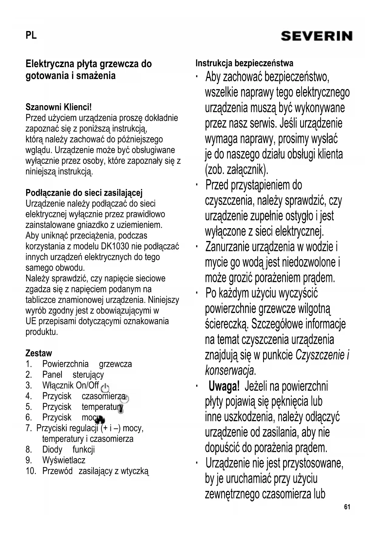 E03 Sisäinen vika Ota yhteyttä asiakaspalveluun. E04 Sisäinen vika Ota yhteyttä asiakaspalveluun. E05 Laitteen toimintona on “teho”, ja kypsennyslämpötila ylittää 100 °C. Katkaise laitteesta virta, kytke se uudelleen ja valitse toiminto “lämpötila”. E06 Sisäinen vika Ota yhteyttä asiakaspalveluun. E07 Kypsennyslämpötila ylittää 240 °C. Katkaise laitteesta virta, irrota pistotulppa pistorasiasta ja anna laitteen jäähtyä. Ota yhteyttä asiakaspalveluun, jos ongelma toistuu.60 E08 Epäsopiva keittoastia (epätasainen pohja) Katso osa “Sopiva keittoastia” Laite on valmiustilassa, näyttö on tyhjä ja laitteesta kuuluu merkkiääniä Epäsopiva keittoastia (pohja ei magneettinen, halkaisija alle 12 cm) Katso osa “Sopiva keittoastia”61 Elektryczna płyta grzewcza do gotowania i smażenia Szanowni Klienci! Przed użyciem urządzenia proszę dokładnie zapoznać się z poniższą instrukcją, którą należy zachować do późniejszego wglądu. Urządzenie może być obsługiwane wyłącznie przez osoby, które zapoznały się z niniejszą instrukcją. Podłączanie do sieci zasilającej Urządzenie należy podłączać do sieci elektrycznej wyłącznie przez prawidłowo zainstalowane gniazdko z uziemieniem. Aby uniknąć przeciążenia, podczas korzystania z modelu DK1030 nie podłączać innych urządzeń elektrycznych do tego samego obwodu. Należy sprawdzić, czy napięcie sieciowe zgadza się z napięciem podanym na tabliczce znamionowej urzą dzenia. Niniejszy wyrób zgodny jest z obowiązującymi w UE przepisami dotyczącymi oznakowania produktu. Zestaw