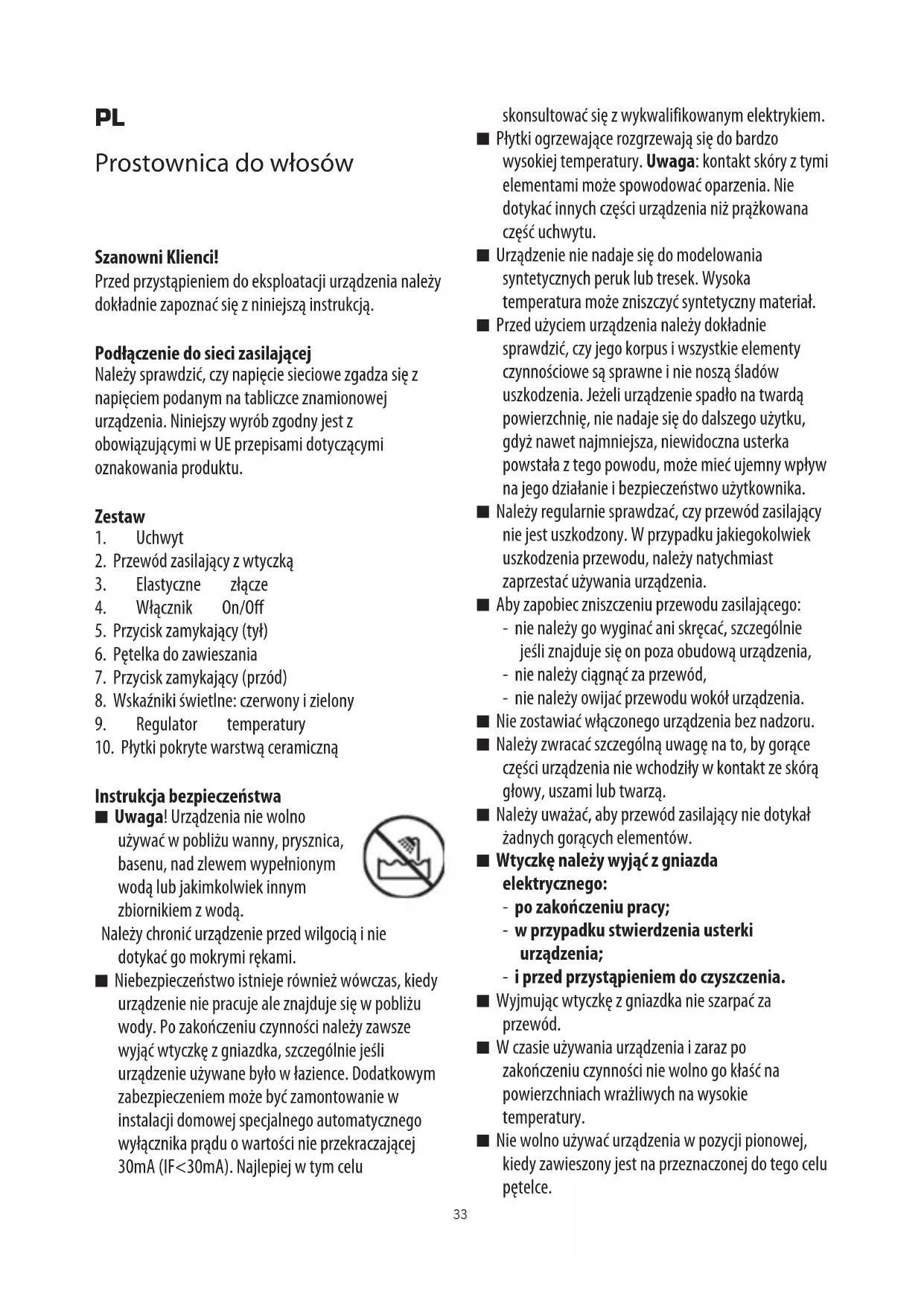 Uwaga! Urzadzenia nie wolno uzywać w基础知识 wanny, prysznica, basenu, nad zlewem wypelnionym woda lub jakimkolwiek innym zbiornikiem z woda.
