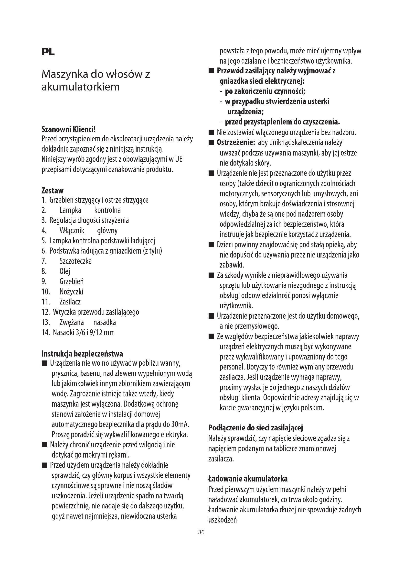 Instrukcja bezpieczeństwa ■ Urządzenia nie wolno używać w pobliżu wanny, prysznica, basenu, nad zlewem wypełnionym wodą lub jakimkolwiek innym zbiornikiem zawierającym wodę. Zagrożenie istnieje także wtedy, kiedy maszynka jest wyłączona. Dodatkową ochronę stanowi założenie w instalacji domowej automatycznego bezpiecznika dla prądu do 30mA. Proszę poradzić się wykwalifikowanego elektryka. ■ Należy chronić urządzenie przed wilgocią i nie dotykać go mokrymi rękami. ■ Przed użyciem urządzenia należy dokładnie sprawdzić, czy główny korpus i wszystkie elementy czynnościowe są sprawne i nie noszą śladów uszkodzenia. Jeżeli urządzenie spadło na twardą powierzchnię, nie nadaje się do dalszego użytku, gdyż nawet najmniejsza, niewidoczna usterka powstała z tego powodu, może mieć ujemny wpływ na jego działanie i bezpieczeństwo użytkownika. ■ Przewód zasilający należy wyjmować z gniazdka sieci elektrycznej: - po zakończeniu czynności; - w przypadku stwierdzenia usterki urządzenia; - przed przystąpieniem do czyszczenia. ■ Nie zostawiać włączonego urządzenia bez nadzoru. ■ Ostrzeżenie: aby uniknąć skaleczenia należy uważać podczas używania maszynki, aby jej ostrze nie dotykało skóry. ■ Urządzenie nie jest przeznaczone do użytku przez osoby (także dzieci) o ograniczonych zdolnościach motorycznych, sensorycznych lub umysłowych, ani osoby, którym brakuje doświadczenia i stosownej wiedzy, chyba że są one pod nadzorem osoby odpowiedzialnej za ich bezpieczeństwo, która instruuje jak bezpiecznie korzystać z urządzenia. ■ Dzieci powinny znajdować się pod stałą opieką, aby nie dopuścić do używania przez nie urządzenia jako zabawki. ■ Za szkody wynikłe z nieprawidłowego używania sprzętu lub użytkowania niezgodnego z instrukcją obsługi odpowiedzialność ponosi wyłącznie użytkownik. ■ Urządzenie przeznaczone jest do użytku domowego, a nie przemysłowego. ■ Ze względów bezpieczeństwa jakiekolwiek naprawy urządzeń elektrycznych muszą być wykonywane przez wykwalifikowany i upoważniony do tego personel. Dotyczy to również wymiany przewodu zasilacza. Jeśli urządzenie wymaga naprawy, prosimy wysłać je do jednego z naszych działów obsługi klienta. Odpowiednie adresy znajdują się w karcie gwarancyjnej w języku polskim. Podłączenie do sieci zasilającej Należy sprawdzić, czy napięcie sieciowe zgadza się z napięciem podanym na tabliczce znamionowej zasilacza. Ładowanie akumulatorka Przed pierwszym użyciem maszynki należy w pełni naładować akumulatorek, co trwa około godziny. Ładowanie akumulatorka dłużej nie spowoduje żadnych uszkodzeń. 36Jeżeli maszynka zacznie wyraźnie zwalniać, albo jeśli lampka kontrolna zapali się na czerwono, należy wyłączyć urządzenie i naładować akumulatorek.