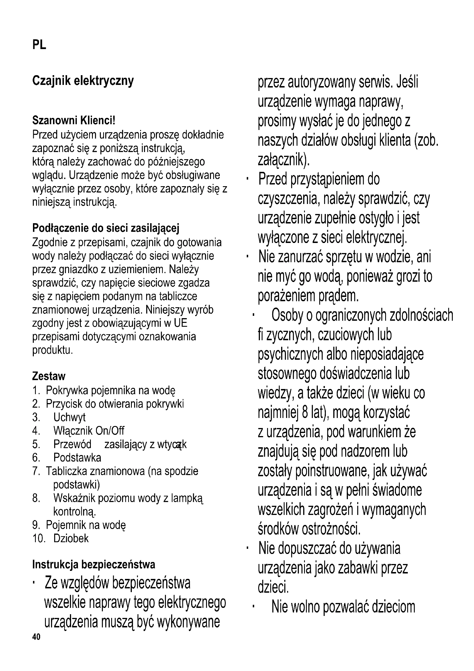 Instrukcja bezpieczeństwa ∙ Ze względów bezpieczeństwa wszelkie naprawy tego elektrycznego urządzenia muszą być wykonywane przez autoryzowany serwis. Jeśli urządzenie wymaga naprawy, prosimy wysłać je do jednego z naszych działów obsługi klienta (zob. załącznik). ∙ Przed przystąpieniem do czyszczenia, należy sprawdzić, czy urządzenie zupełnie ostygło i jest wyłączone z sieci elektrycznej. ∙ Nie zanurzać sprzętu w wodzie, ani nie myć go wodą, ponieważ grozi to porażeniem prądem. ∙ Osoby o ograniczonych zdolnościach fi zycznych, czuciowych lub psychicznych albo nieposiadające stosownego doświadczenia lub wiedzy, a także dzieci (w wieku co najmniej 8 lat), mogą korzystać z urządzenia, pod warunkiem że znajdują si ę pod nadzorem lub zostały poinstruowane, jak używać urządzenia i są w pełni świadome wszelkich zagrożeń i wymaganych środków ostrożności. ∙ Nie dopuszczać do używania urządzenia jako zabawki przez dzieci. ∙ Nie wolno pozwalać dzieciom PL41 na wykonywanie jakichkolwiek prac związanych bezpośrednio z konserwacją lub czyszczeniem urządzenia bez nadzoru osoby dorosłej. ∙ Nie dopuszczać do urządzenia i jego przewodu zasilającego dzieci w wieku poniżej 8 lat. ∙ Urządzenie przeznaczone jest do zastosowań domowych lub podobnych, jak np. w - biurach lub innych miejscach pracy; - agroturystyce; - hotelach, motelach itp. oraz innych podobnych miejscach zakwaterowania (przez klientów); - pensjonatach. ∙ Nie należy zostawiać włączonego czajnika bez nadzoru. Używać wyłącznie czystej wody i uważać, aby przy napełnianiu pojemnika poziom wody zawsze znajdował się pomiędzy oznaczeniami: minimum/ maksimum. Przepełnienie pojemnika grozi wylaniem się wrzątku z urządzenia. ∙ Należy także uważa ć, aby nie oparzyć się gorącą parą wydobywającą się podczas gotowania. Nie dotykać żadnych części urządzenia oprócz uchwytu. ∙ Uwaga! Podczas gotowania a także wylewania gorącej wody, pokrywka pojemnika na wodę musi być zamknięta. ∙ Korzystając z czajnika należy używać wyłącznie dostarczonej wraz z nim podstawki. ∙ Nie wolno zdejmować pojemnika na wodę z podstawki (lub wymieniać go) kiedy urządzenie jest włączone. ∙ Uwaga: Nie pozwalać, aby dzieci miały dostęp do elementów opakowania, ponieważ może to doprowadzić do niebezpiecznego wypadku, np. uduszenia. ∙ Przed użyciem urządzenia należy dokładnie sprawdzić, czy jego korpus i wszystkie elementy czynnościowe są sprawne i nie noszą śladów uszkodzenia. Jeżeli urządzenie np. spadło na twardą powierzchnię albo przewód zasilający został narażony na zbyt silne szarpnięcie, nie nadaje się ono do dalszego użytku: nawet najmniejsza, niewidoczna usterka powstała z tego powodu, może mieć ujemny wpływ na działanie urządzenia i bezpieczeństwo użytkownika. ∙ Urządzenie musi zawsze być ustawione na równej i stabilnej powierzchni, odpornej na wysokie temperatury. ∙ Nie włączać urządzenia, kiedy znajduje się ono pod wiszącą szafką, półką lub innym podobnym przedmiotem; istnieje42 ryzyko gromadzenia się nadmiernej ilości pary. ∙ Korpus urządzenia rozgrzewa się do wysokiej temperatury w trakcie pracy i pozostaje gorący przez jakiś czas po jej zakończeniu. ∙ Należy uważać, aby przewód zasilający i korpus czajnika nie wchodziły w kontakt z płomieniami lub gorącymi powierzchniami, np. płytą kuchenki lub grzejną. ∙ Przewód zasilający nie powinien swobodnie zwisać i należy go zabezpieczyć przed stykaniem się z rozgrzanymi częściami urządzenia. ∙ Wtyczkę należy wyjąć z gniazdka elektrycznego: - po zakończeniu pracy - w przypadku awarii urządzenia - przed przystąpieniem do czyszczenia urządzenia. ∙ Za szkody wynikłe z nieprawidłowego