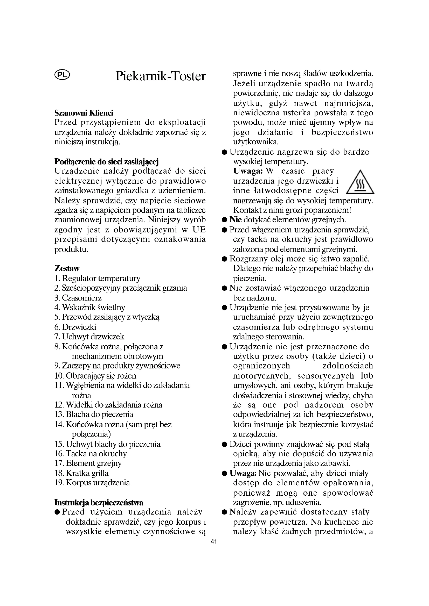 Piekarnik-Toster ponadto należy zapewnić, by wolna przestrzeń wokół urządzenia była nie mniejsza niż podano poniżej: Po bokach: 12 cm Z tyłu: 12 cm Z góry: 12 cm ● Nie należy używać urządzenia w pobliżu półek ściennych lub pod przedmiotami wiszącymi takimi jak firanki czy inne łatwopalne tworzywa. ● Podczas pracy urządzenie musi być ustawione na powierzchni odpornej na wysokie temperatury i odpryski tłuszczu. Nie należy ustawiać urządzenia w pobliżu gorących powierzchni, otwartego ognia lub łatwopalnych oparów. ● Należy uważać, aby przewód zasilający nie stykał się z gorącymi elementami. ● Nie należy pozostawiać przewodu zasilającego swobodnie zwisającego. ● Wtyczkę należy wyjąć z gniazdka każdorazowo: - po zakończeniu pracy; - w przypadku awarii urządzenia; - i przed przystąpieniem do czyszczenia urządzenia. ● Wyjmując wtyczkę z gniazdka nigdy nie należy szarpać za przewód. ● Za szkody wynikłe z nieprawidłowego używania sprzętu lub użytkowania niezgodnego z instrukcją obsługi odpowiedzialność ponosi wyłącznie użytkownik. ● Urządzenie przeznaczone jest do użytku domowego, a nie przemysłowego. ● Ze względów bezpieczeństwa wszelkie naprawy urządzeń elektrycznych muszą być dokonywane przez wykwalifikowany i upoważniony do tego personel. Dotyczy to również wymiany przewodu zasilającego. Jeśli urządzenie wymaga naprawy, prosimy wysłać je do jednego z naszych działów obsługi klienta. Odpowiednie adresy znajdują się w karcie gwarancyjnej w języku polskim. Regulator temperatury Gałka regulatora temperatury służy do ustawienia odpowiedniej mocy grzania. Sześciopozycyjny przełącznik grzania Górny element Górny i dolny element Górny element z termoobiegiem Górny i dolny element z termoobiegiem Górny element z obracającym się rożnem Górny element z termoobiegiem i obracającym się rożnem Elementy grzejne włączają się dopiero po nastawieniu czasomierza. Czasomierz Czasomierz może być wykorzystywany do ustawienia określonego czasu pracy (do 60 min) albo do ustawienia pracy ciągłej. Aby ustawić pracę ciągłą, przekręcić czasomierz w lewo do pozycji . Aby wyłączyć urządzenie, ustawić pokrętło w pozycji . Aby zaprogramować czas pracy, przekręcić pokrętło w prawo do żądanej pozycji. Aby ustawić czas pracy krótszy niż 10 minut, najpierw przekręcić czasownik na nieco wyższą pozycję, po czym powoli przekręcić go z powrotem do żądanego ustawienia. Po upływie zaprogramowanego czasu słychać będzie sygnał dźwiękowy, który informuje o wyłączeniu się elementów grzejnych. Wskaźnik świetlny Wskaźnik świetlny zapala się, kiedy urządzenie jest włączone. Gaśnie, kiedy upłynie zaprogramowany czas pracy lub kiedy pokrętło zostanie ustawione w pozycji
