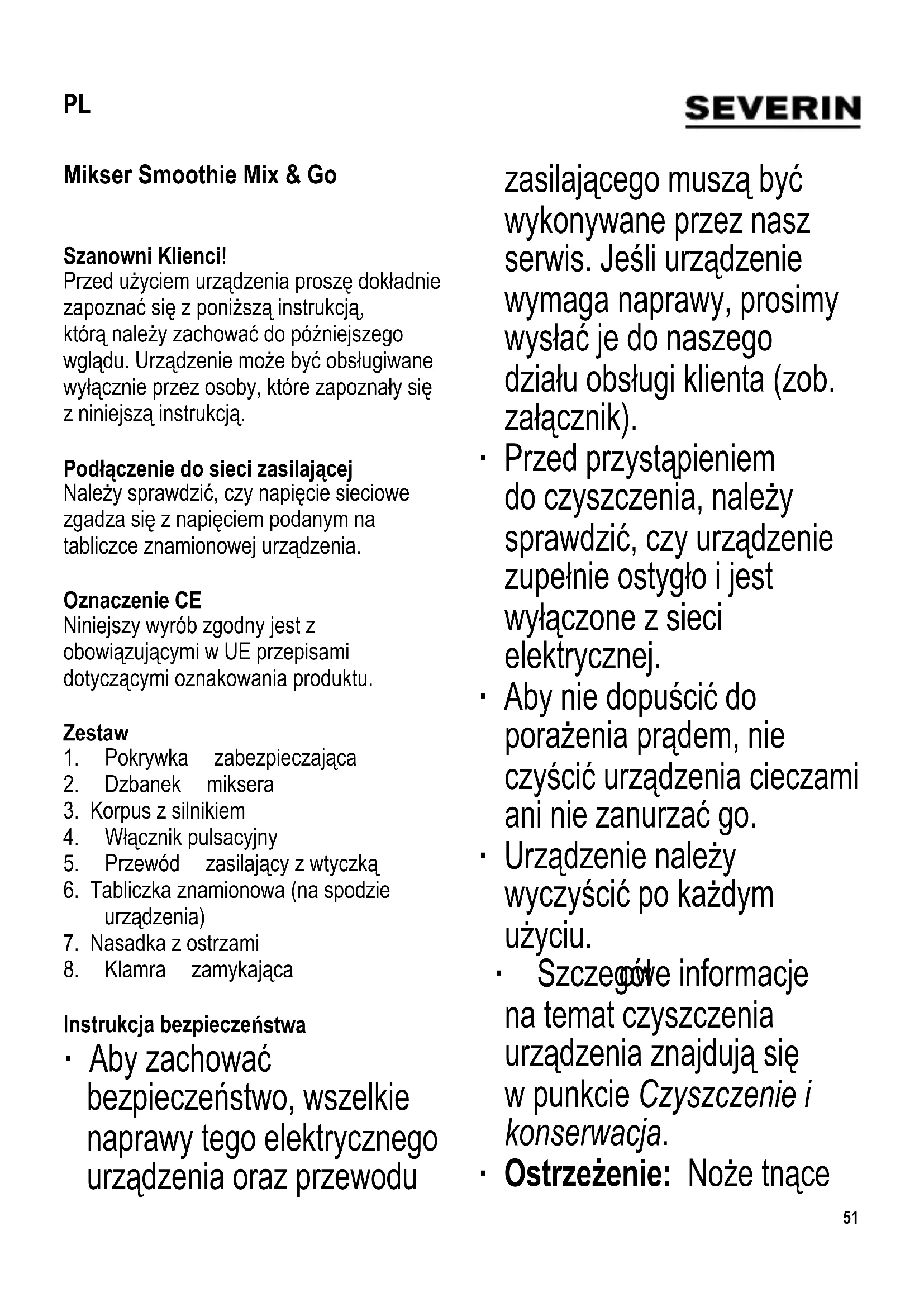 Instrukcja bezpiecze ństwa ∙ Aby zachować bezpieczeństwo, wszelkie naprawy tego elektrycznego urządzenia oraz przewodu zasilającego muszą być wykonywane przez nasz serwis. Jeśli urządzenie wymaga naprawy, prosimy wysłać je do naszego działu obsługi klienta (zob. załącznik). ∙ Przed przystąpieniem do czyszczenia, należy sprawdzić, czy urządzenie zupełnie ostygło i jest wyłączone z sieci elektrycznej. ∙ Aby nie dopuścić do porażenia prądem, nie czyścić urządzenia cieczami ani nie zanurzać go. ∙ Urządzenie należy wyczyścić po każdym użyciu. ∙ Szczegół owe informacje na temat czyszczenia urządzenia znajdują się w punkcie Czyszczenie i konserwacja. ∙ Ostrzeżenie: Noże tnące PL52 miksera są bardzo ostre i można się nimi skaleczyć. Aby uniknąć obrażeń, podczas opróżniania dzbanka miksera oraz czyszczenia urządzenia należy zachować szczególną ostrożność. ∙ Ostrzeżenie: Nie wkładać do dzbanka gorących składników. ∙ Podczas wlewania gorących płynów zachować szczególną ostrożność, aby nie oparzyć się gorącą parą wylatującą z urządzenia. ∙ Ostrzeżenie: Nieprawidłowe użytkowanie urządzenia moż