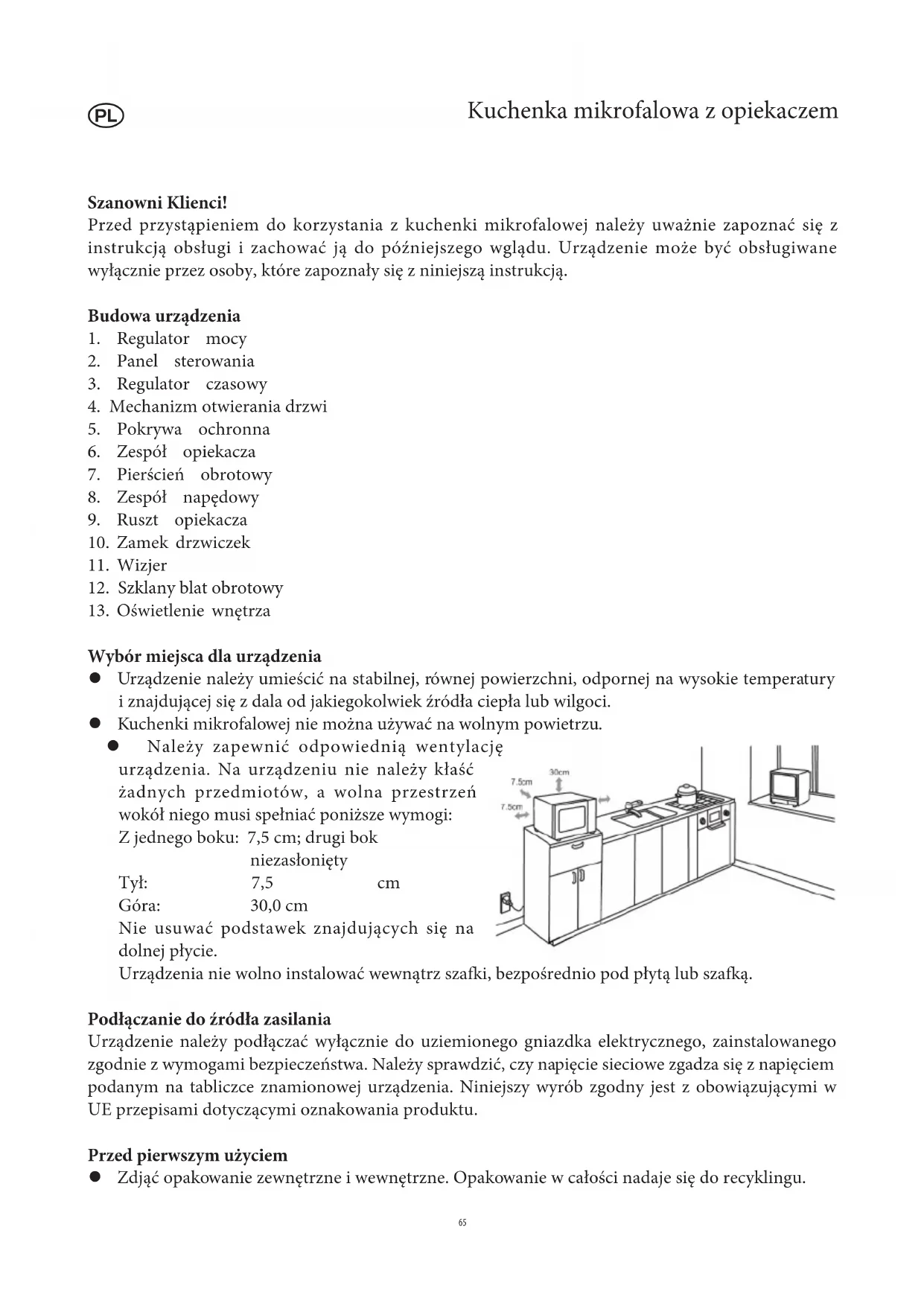 Wybór miejsca dla urządzenia Urządzenie należy umieścić na stabilnej, równej powierzchni, odpornej na wysokie temperatury i znajdującej się z dala od jakiegokolwiek źródła ciepła lub wilgoci. Kuchenki mikrofalowej nie można używać na wolnym powietrzu. Należy zapewnić odpowiednią wentylację urządzenia. Na urządzeniu nie należy kłaść żadnych przedmiotów, a wolna przestrzeń wokół niego musi spełniać poniższe wymogi: Z jednego boku: 7,5 cm; drugi bok niezasłonięty Tył: 7,5 cm Góra: 30,0 cm Nie usuwać podstawek znajdujących się na dolnej płycie. Urządzenia nie wolno instalować wewnątrz szafki, bezpośrednio pod płytą lub szafką. Podłączanie do źródła zasilania Urządzenie należy podłączać wyłącznie do uziemionego gniazdka elektrycznego, zainstalowanego zgodnie z wymogami bezpieczeństwa. Należy sprawdzić, czy napięcie sieciowe zgadza się z napięciem podanym na tabliczce znamionowej urządzenia. Niniejszy wyrób zgodny jest z obowiązującymi w UE przepisami dotyczącymi oznakowania produktu. Przed pierwszym użyciem Zdjąć opakowanie zewnętrzne i wewnętrzne. Opakowanie w całości nadaje się do recyklingu.