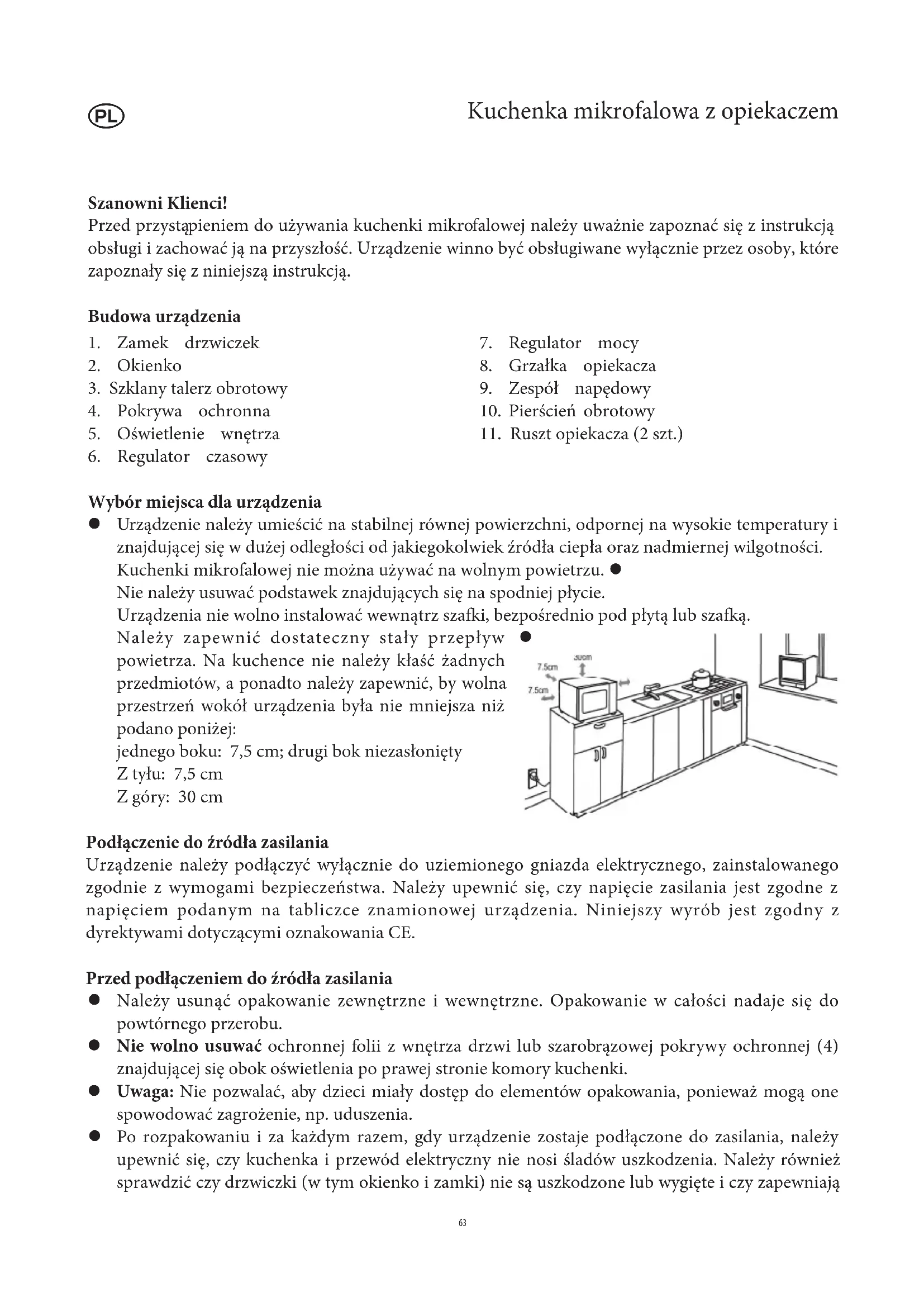 Wybór miejsca dla urządzenia Urządzenie należy umieścić na stabilnej równej powierzchni, odpornej na wysokie temperatury i z znajdującej się w dużej odległości od jakiegokolwiek źródła ciepła oraz nadmiernej wilgotności. Kuchenki mikrofalowej nie można używać na wolnym powietrzu. z Nie należy usuwać podstawek znajdujących się na spodniej płycie. Urządzenia nie wolno instalować wewnątrz szafki, bezpośrednio pod płytą lub szafką. Należy zapewnić dostateczny stały przepływ z powietrza. Na kuchence nie należy kłaść żadnych przedmiotów, a ponadto należy zapewnić, by wolna przestrzeń wokół urządzenia była nie mniejsza niż podano poniżej: jednego boku: 7,5 cm; drugi bok niezasłonięty Z tyłu: 7,5 cm Z góry: 30 cm Podłączenie do źródła zasilania Urządzenie należy podłączyć wyłącznie do uziemionego gniazda elektrycznego, zainstalowanego zgodnie z wymogami bezpieczeństwa. Należy upewnić się, czy napięcie zasilania jest zgodne z napięciem podanym na tabliczce znamionowej urządzenia. Niniejszy wyrób jest zgodny z dyrektywami dotyczącymi oznakowania CE. Przed podłączeniem do źródła zasilania Należy usunąć opakowanie zewnętrzne i wewnętrzne. Opakowanie w całości nadaje się do z powtórnego przerobu. Nie wolno usuwać z ochronnej folii z wnętrza drzwi lub szarobrązowej pokrywy ochronnej (4) znajdującej się obok oświetlenia po prawej stronie komory kuchenki. Uwaga: z Nie pozwalać, aby dzieci miały dostęp do elementów opakowania, ponieważ mogą one spowodować zagrożenie, np. uduszenia. Po rozpakowaniu i za każdym razem, gdy urządzenie zostaje podłączone do zasilania, należy z upewnić się, czy kuchenka i przewód elektryczny nie nosi śladów uszkodzenia. Należy również sprawdzić czy drzwiczki (w tym okienko i zamki) nie są uszkodzone lub wygięte i czy zapewniająszczelne zamkniecie urządzenia. Należy zwrócić uwagę, by w trakcie pracy z kuchenki nie wydostawała się energia mikrofalowa. Z tych samych względów istotne jest sprawdzenie szczelności pozostałych elementów obudowy zewnętrznej, jak również ścianek komory kuchenki. Jeśli urządzenie nosi ślady uszkodzenia, nie wolno go używać zanim nie zostanie naprawione przez odpowiednio wykwalifikowanego serwisanta. Przed użyciem urządzenia po raz pierwszy oraz po dłuższym czasie nieużywania należy z wyczyścić je według instrukcji w punkcie Czyszczenie i konserwacja. Zamontować w urządzeniu zespół napędowy, pierścień obrotowy i szklany talerz obrotowy. z Przed pierwszym użyciem kuchenki należy nastawić ją na funkcję opiekacza i rozgrzewać przez z 10 minut (funkcja kuchenki mikrofalowej powinna być wyłączona w tym czasie). Ma to na celu usunięcie specyficznego zapachu, który zazwyczaj pojawia się przy pierwszym użyciu opiekacza. W trakcie tej czynności może pojawić się niewielka ilość dymu, co jest zupełnie normalne, niemniej należy zapewnić odpowiednią wentylację pomieszczenia. Uwaga: Nie włączać funkcji mikrofal w kuchence, jeżeli wewnątrz nie ma żadnego jedzenia lub napoju przeznaczonego do podgrzania. Posługiwanie się włączoną kuchenką mikrofalową przy pustej komorze kuchenki może doprowadzić do uszkodzenia urządzenia. Ważne wskazówki Podczas podgrzewania płynów w kuchence mikrofalowej może się zdarzyć, iż płyn ulegnie z zagotowaniu bez widocznych objawów wrzenia. Należy zatem zachować szczególną ostrożność w obchodzeniu się z pojemnikami, np. podczas wyjmowania ich z kuchenki. Umieszczenie w pojemniku z podgrzewanym płynem pręta ze szkła żaroodpornego zmniejsza ryzyko wystąpienia tego zjawiska. W kuchence mikrofalowej nie wolno podgrzewać jajek w skorupkach lub jajek ugotowanych na z twardo, ponieważ mogą one eksplodować nawet po zakończeniu procesu podgrzewania. Ostrzeżenie z : Podgrzewanie w kuchence mikrofalowej płynów lub potraw zamkniętych w pojemnikach jest bardzo niebezpieczne i grozi eksplozją. Zawartość podgrzewanej butelki lub innego opakowania szklanego zawierającego pokarm dla z dziecka należy starannie wymieszać lub wstrząsnąć w celu zapewnienia równomiernego rozkładu temperatury w pokarmie. W celu uniknięcia bolesnych i niebezpiecznych oparzeń zawsze należy sprawdzić temperaturę pokarmu przed podaniem go dziecku. W trakcie podgrzewania lub gotowania potraw opakowanych w materiały łatwopalne, takie jak z tworzywo sztuczne lub papier, istnieje niebezpieczeństwo zapalenia się opakowania. Pojawia się ono również wówczas, gdy na skutek ustawienia zbyt długiego czasu gotowania potrawa zbytnio się wysuszy i w konsekwencji zapali. Tłuszcze i oleje są również substancjami łatwopalnymi. Z tego względu pracującego urządzenia nie należy pozostawiać bez nadzoru. Łatwopalnych płynów, na przykład zawierających wysokoprocentowy alkohol, z oczywistych względów nie należy podgrzewać. Jeżeli w trakcie pracy kuchenki pojawi się dym, drzwiczki powinny pozostać zamknięte, aby z utrudnić zapalenie się potrawy lub by ugasić płomień. Należy natychmiast wyłączyć urządzenie i wyjąć przewód zasilający z gniazda elektrycznego. Aby uniknąć oparzenia podczas wyjmowania pojemników z urządzenia, należy zawsze chwytać z je przez odpowiednie rękawice kuchenne lub ściereczkę, ponieważ naczynia kuchenne i pojemniki mocno rozgrzewają się podczas korzystania nie tylko z opiekacza, lecz również z kuchenki mikrofalowej. Specjalne termometry (używane do pomiaru temperatury w zwykłych piekarnikach) nie nadają z się do stosowania w kuchenkach mikrofalowych. 64Instrukcja bezpieczeństwa Ostrzeżenie: niektóre rodzaje żywności mogą się łatwo zapalić. Nie wolno pozostawiać z włączonego urządzenia bez nadzoru. Kuchenka mikrofalowa jest przeznaczona wyłącznie do rozmrażania, podgrzewania i gotowania z potraw. Producent nie ponosi odpowiedzialności za szkody wynikłe w skutek niepr