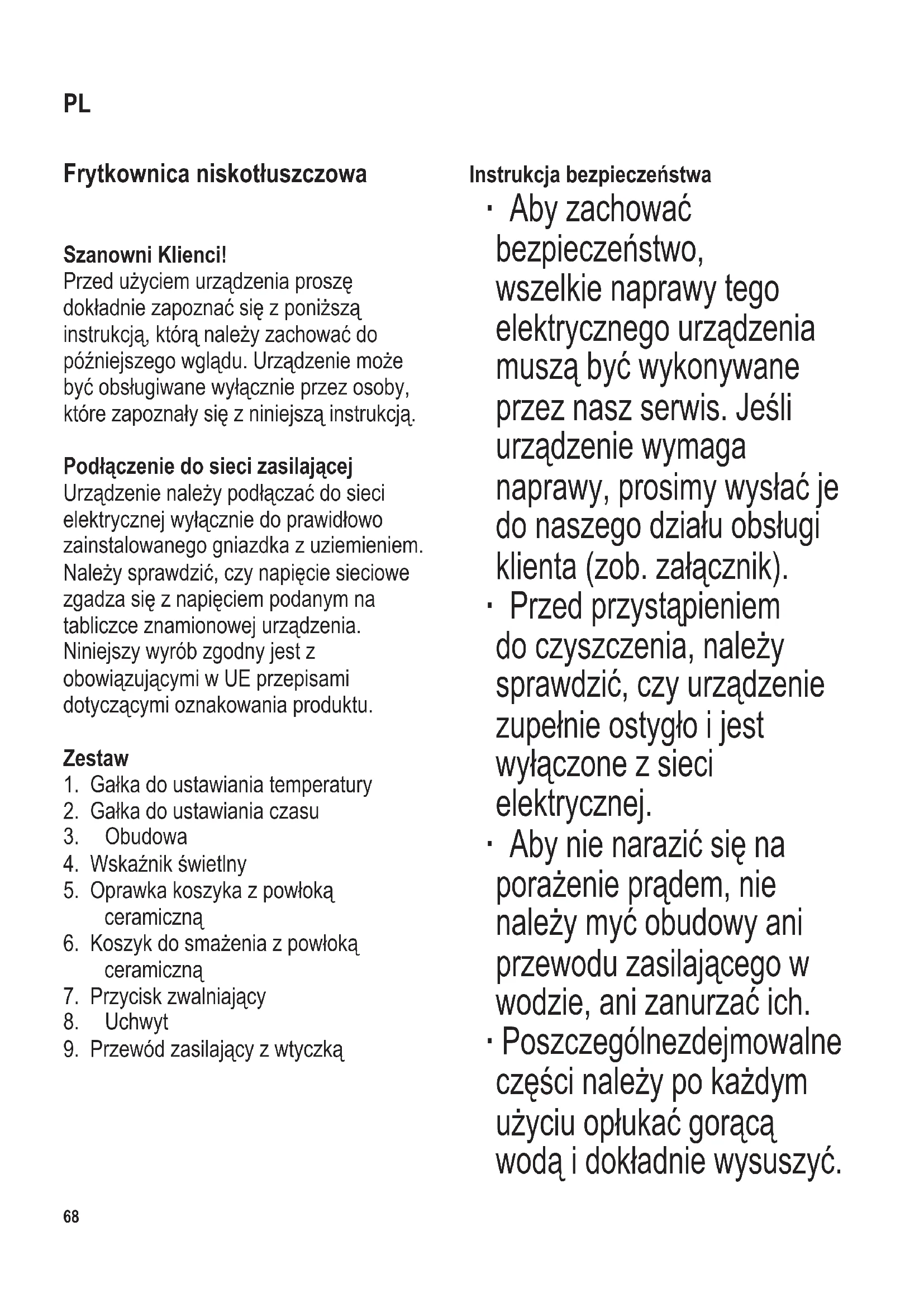 Instrukcja bezpieczeństwa ∙ Aby zachować bezpieczeństwo, wszelkie naprawy tego elektrycznego urządzenia muszą być wykonywane przez nasz serwis. Jeśli urządzenie wymaga naprawy, prosimy wysłać je do naszego działu obsługi klienta (zob. załącznik). ∙ Przed przystąpieniem do czyszczenia, należy sprawdzić, czy urządzenie zupełnie ostygło i jest wyłączone z sieci elektrycznej. ∙ Aby nie narazić się na porażenie prądem, nie należy myć obudowy ani przewodu zasilającego w wodzie, ani zanurzać ich. ∙ Poszczególne zdejmowalne części należy po każdym użyciu opłukać gorącą wodą i dokładnie wysuszyć. PL104 x 142 mm