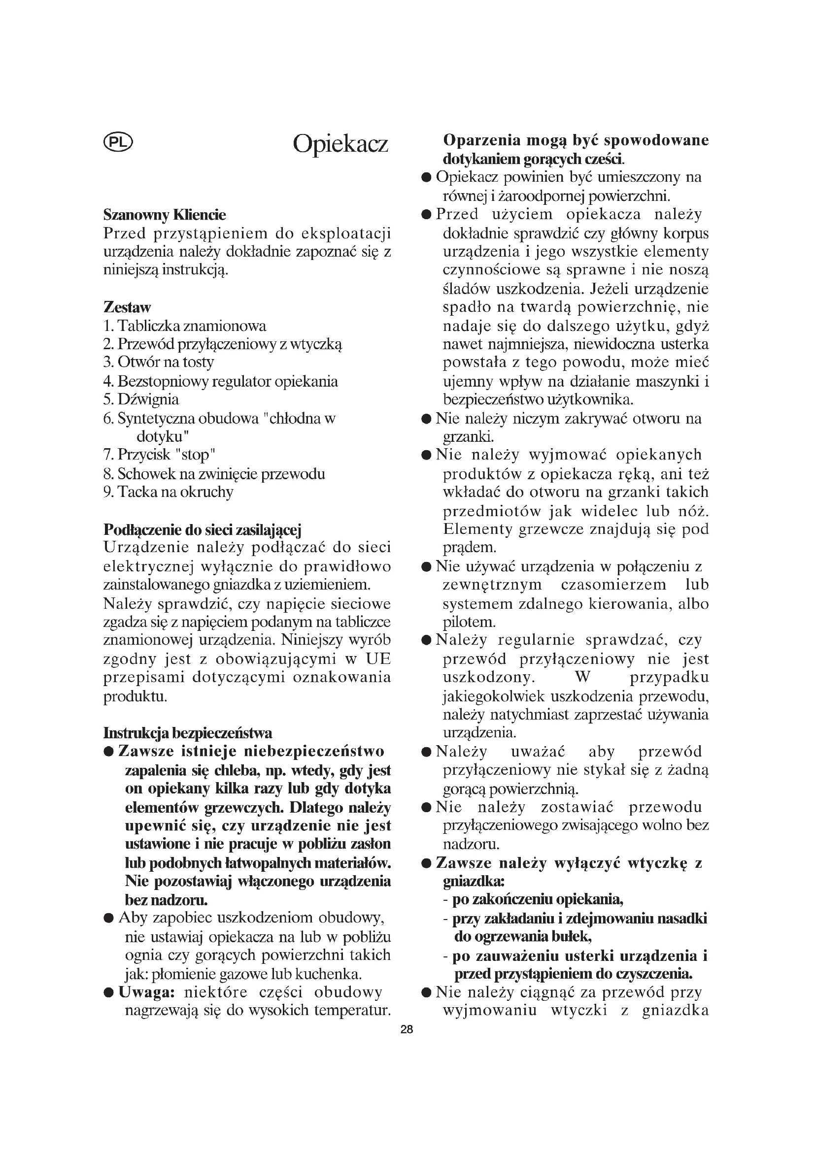 Podłączenie do sieci zasilającej Urządzenie należy podłączać do sieci elektrycznej wyłącznie do prawidłowo zainstalowanego gniazdka z uziemieniem. Należy sprawdzić, czy napięcie sieciowe zgadza się z napięciem podanym na tabliczce znamionowej urządzenia. Niniejszy wyrób zgodny jest z obowiązującymi w UE przepisami dotyczącymi oznakowania produktu. Instrukcja bezpieczeństwa ● Zawsze istnieje niebezpieczeństwo zapalenia się chleba, np. wtedy, gdy jest on opiekany kilka razy lub gdy dotyka elementów grzewczych. Dlatego należy upewnić się, czy urządzenie nie jest ustawione i nie pracuje w pobliżu zasłon lub podobnych łatwopalnych materiałów. Nie pozostawiaj włączonego urządzenia bez nadzoru. ● Aby zapobiec uszkodzeniom obudowy, nie ustawiaj opiekacza na lub w pobliżu ognia czy gorących powierzchni takich jak: płomienie gazowe lub kuchenka. ● Uwaga: niektóre części obudowy nagrzewają się do wysokich temperatur. Oparzenia mogą być spowodowane dotykaniem gorących cześci. ● Opiekacz powinien być umieszczony na równej i żaroodpornej powierzchni. ● Przed użyciem opiekacza należy dokładnie sprawdzić czy główny korpus urządzenia i jego wszystkie elementy czynnościowe są sprawne i nie noszą śladów uszkodzenia. Jeżeli urządzenie spadło na twardą powierzchnię, nie nadaje się do dalszego użytku, gdyż nawet najmniejsza, niewidoczna usterka powstała z tego powodu, może mieć ujemny wpływ na działanie maszynki i bezpieczeństwo użytkownika. ● Nie należy niczym zakrywać otworu na grzanki. ● Nie należy wyjmować opiekanych produktów z opiekacza ręką, ani też wkładać do otworu na grzanki takich przedmiotów jak widelec lub nóż. Elementy grzewcze znajdują się pod prądem. ● Nie używać urządzenia w połączeniu z zewnętrznym czasomierzem lub systemem zdalnego kierowania, albo pilotem. ● Należy regularnie sprawdzać, czy przewód przyłączeniowy nie jest uszkodzony. W przypadku jakiegokolwiek uszkodzenia przewodu, należy natychmiast zaprzestać używania urządzenia. ● Należy uważać aby przewód przyłączeniowy nie stykał się z żadną gorącą powierzchnią. ● Nie należy zostawiać przewodu przyłączeniowego zwisającego wolno bez nadzoru. ● Zawsze należy wyłączyć wtyczkę z gniazdka: - po zakończeniu opiekania, - przy zakładaniu i zdejmowaniu nasadki do ogrzewania bułek, - po zauważeniu usterki urządzenia i przed przystąpieniem do czyszczenia. ● Nie należy ciągnąć za przewód przy wyjmowaniu wtyczki z gniazdka