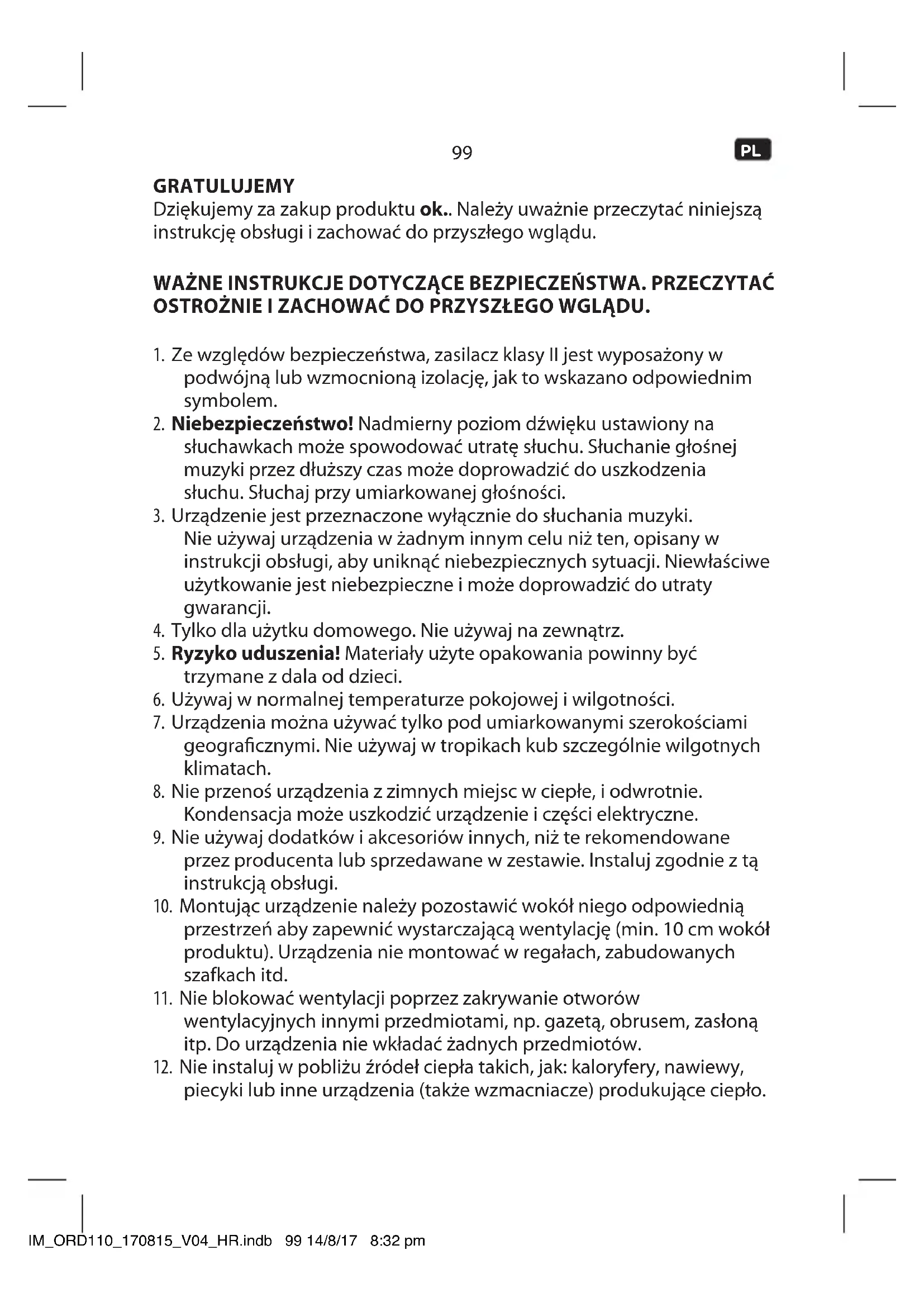 J. Gniazdko słuchawkowe K. Gniazdko DC-IN L. Przegródka na baterie M. Zasilacz AC/DC AKCESORIA 1 x Zasilacz sieciowy AC/DC 1 x Instrukcja obsługi PRZED PIERWSZYM UżYCIEM Produkt wraz z wyposażeniem należy ostrożnie wyjąć z oryginalnego opakowania. Zawartość opakowania należy sprawdzić pod względem kompletności i uszkodzeń. W przypadku braku części w opakowaniu lub w razie stwierdzenia uszkodzeń należy skontaktować się z punktem sprzedaży. IM_ORD110_170815_V04_HR.indb 102 14/8/17 8:32 pm103