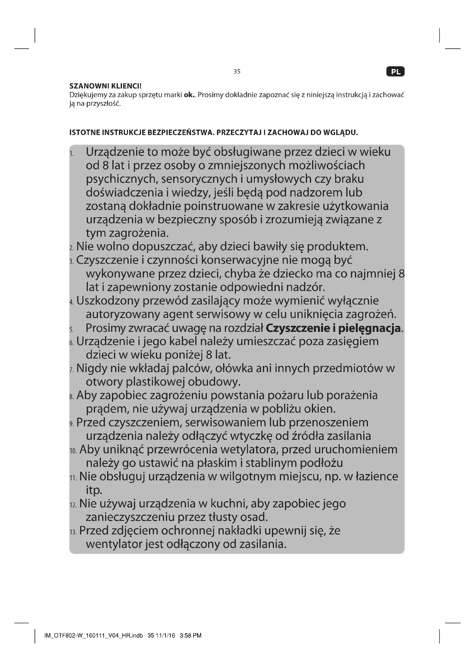 OTF 802W - Wentylator OK - Bezpłatna instrukcja obsługi