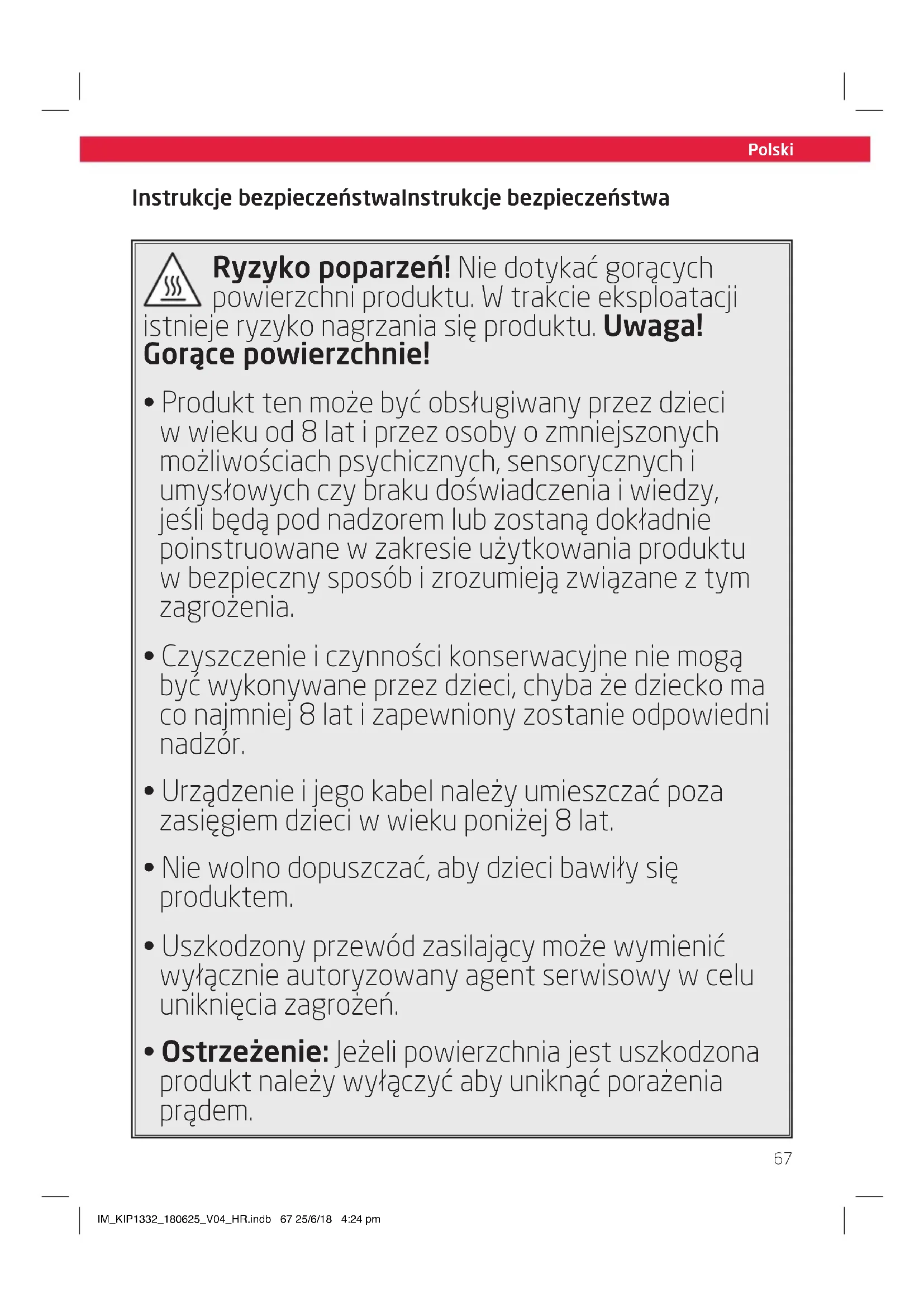 - Ostrzeżenie: Jeżeli powierzchnia jest uszkodzona produkt należy wyłączyć aby uniknąć porażenia prądem. IM_KIP1332_180625_V04_HR.indb 67 25/6/18 4:24 pmPolski