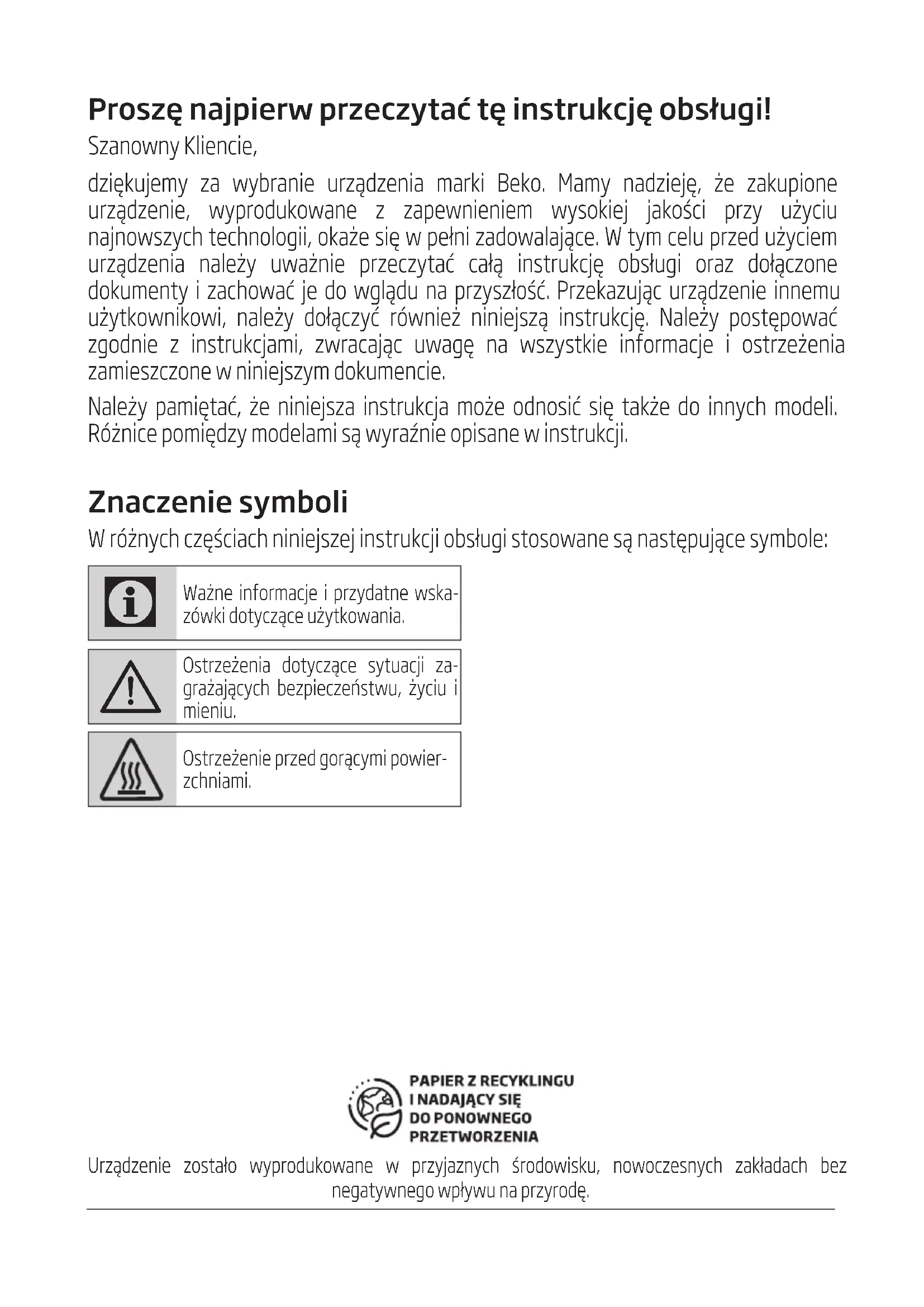 Prima di contattare l’assistenza tecnica, al ne di agevolare la gestione della chiamata, è necessario avere a portata di mano il modello del prodotto e il documento scale di acquisto.Proszę najpierw przeczytać tę instrukcję obsługi! Szanowny Klence, dzękujemy za wybrane urządzena mark Beko. Mamy nadzeję, że zakupone urządzene, wyprodukowane z zapewnenem wysokej jakośc przy użycu najnowszych technolog, okaże sę w pełn zadowalające. W tym celu przed użycem urządzena należy uważne przeczytać całą nstrukcję obsług oraz dołączone dokumenty zachować je do wglądu na przyszłość. Przekazując urządzene nnemu użytkownkow, należy dołączyć równeż nnejszą nstrukcję. Należy postępować zgodne z nstrukcjam, zwracając uwagę na wszystke nformacje ostrzeżena zameszczone w nnejszym dokumence. Należy pamętać, że nnejsza nstrukcja może odnosć sę także do nnych model. Różnce pomędzy modelam są wyraźne opsane w nstrukcj. Znaczenie symboli W różnych częścach nnejszej nstrukcj obsług stosowane są następujące symbole: